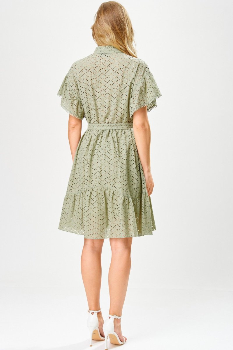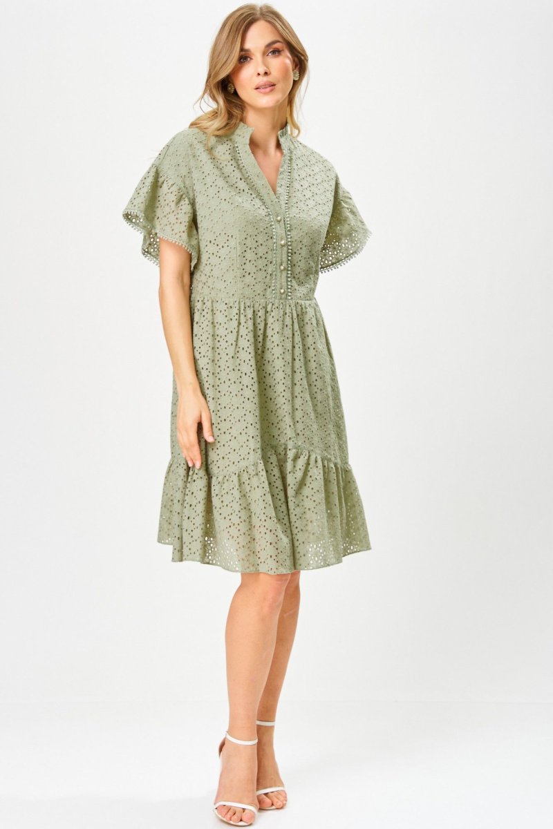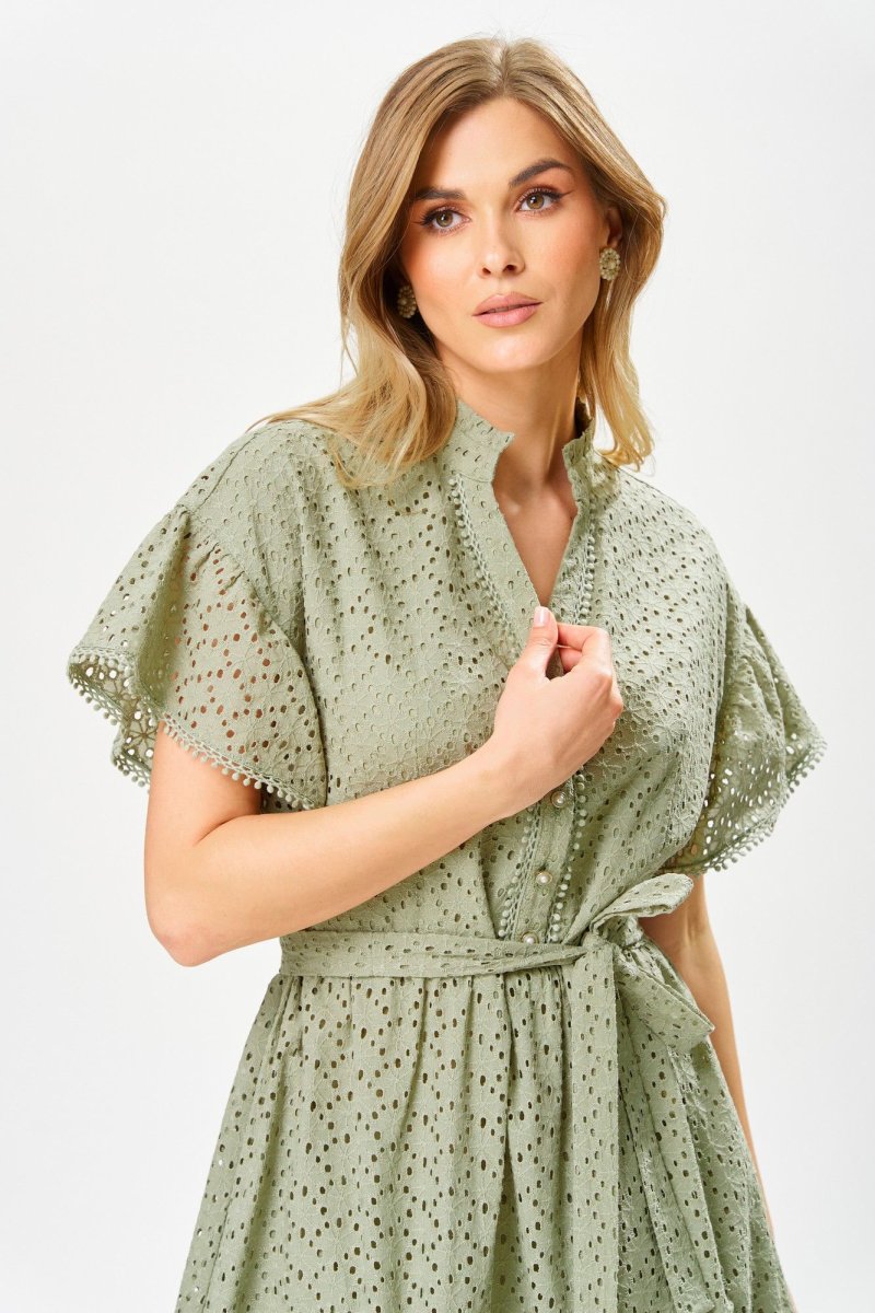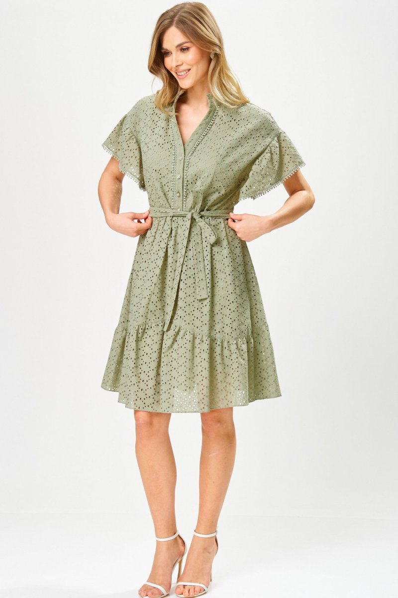 Платье женское из перфорированного хлопка, свободного силуэта, на подкладке,расширенное книзу, длиной ниже коленей,с втачной стойкой по горловине, отрезное на уровне линии талии, со съемным поясом. Лиф деталей переда платья с застежкой на 4 петли и 4 пуговицы, с «V-образным» вырезом, с нагрудными вытачками, исходящие от линии талии, с притачными планками. В шов притачивания планок вставлена декоративная тесьма. Юбка платья конической формы, с горизонтальным подрезом фигурной формы, по швам соединения обработана сборка. Рукава втачные одношовные, короткие, со сборкой по шву втачивания, низ рукавов декорирован отделочной тесьмой. По горловине втачная стойка с «рюшей». Длина рукава – 12см, ширина рукава – 33см, длина спинки – 98см.