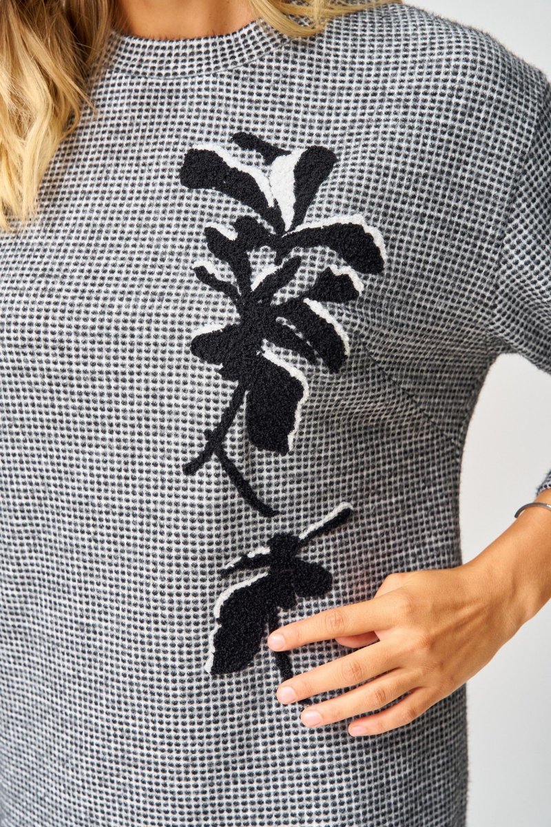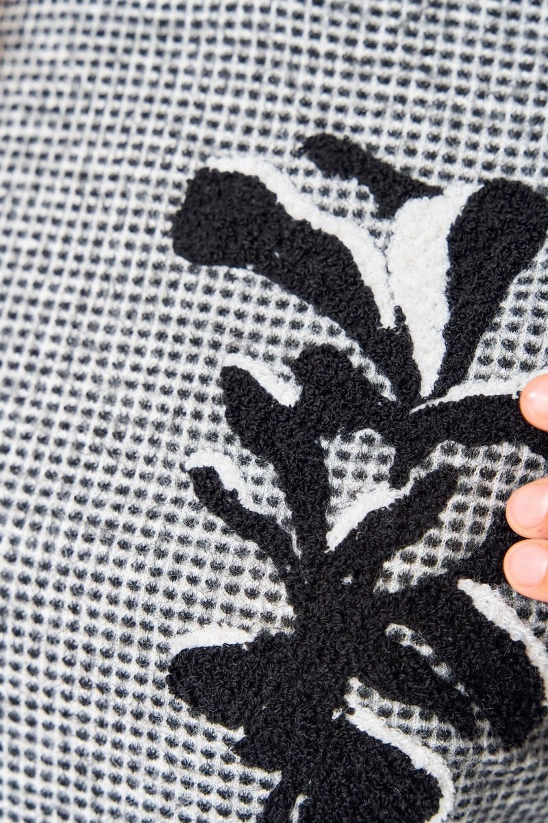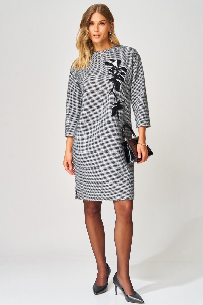 Вырез горловины округлой формы с втачной бейкой. Деталь переда с нагрудными вытачками, вверху нанесена аппликация-вышивка. Спинка цельная. Рукава втачные одношовные, длиной 3/4, линия плеча спущена. В боковых швах обработаны карманы и разрезы.