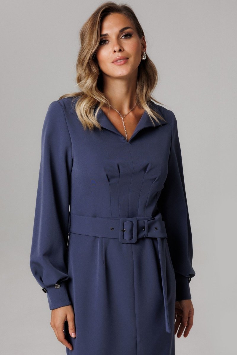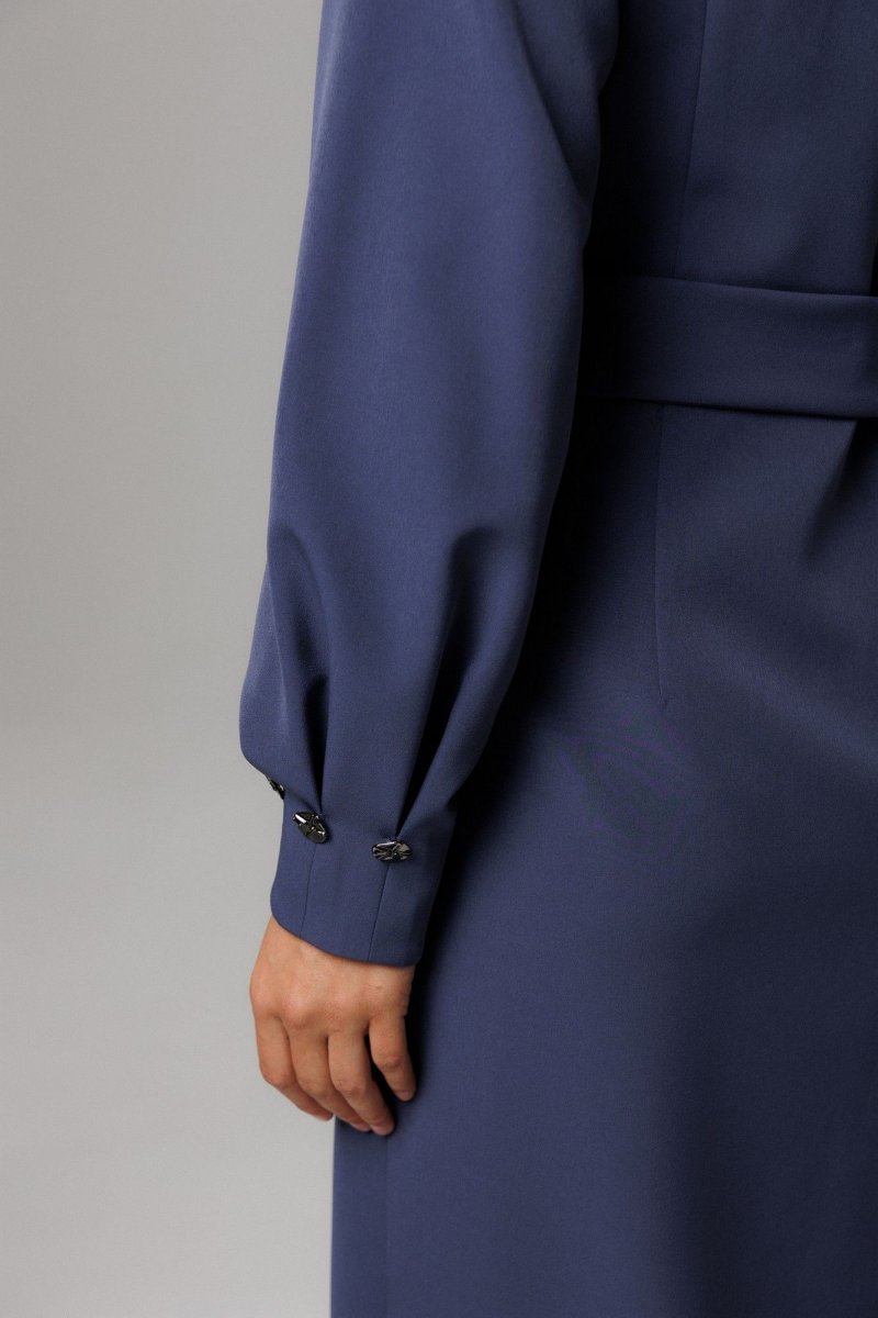 Вырез «V-образной» формы, обработан обтачкой. Перед и спинка платья отрезные по линии талии. Перед со средним швом, который заканчивается разрезом, и декоративными талиевыми вытачками. Рукава втачные одношовные, по низу обработаны по 3 складки, на которых декоративно прикреплены по 3 пуговицы. Низ рукавов обработан обтачкой. На уровне талии расположены шлевки.