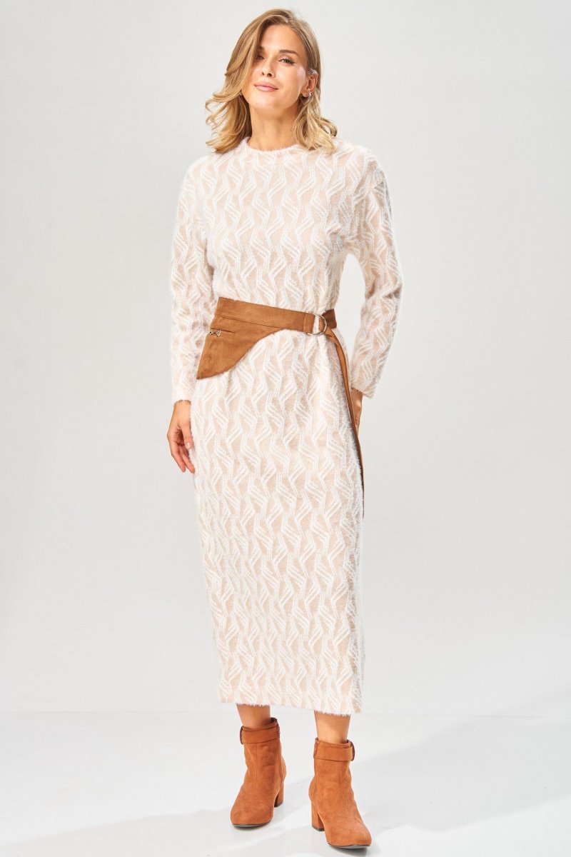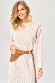 Вырез горловины округлой формы с втачной бейкой. Перед и спинка цельные. Рукава втачные одношовные длинные, линия плеча спущена. В левом боковом шве обработан разрез. В комплекте съемный пояс с застежкой на пряжку. На съемном поясе обработан карман с листочкой с втачными концами.