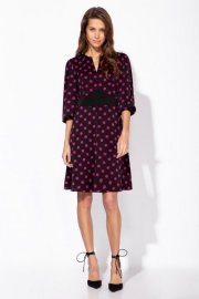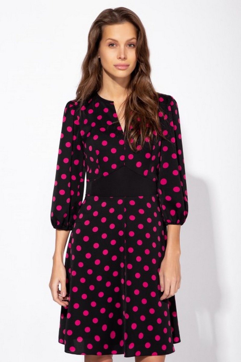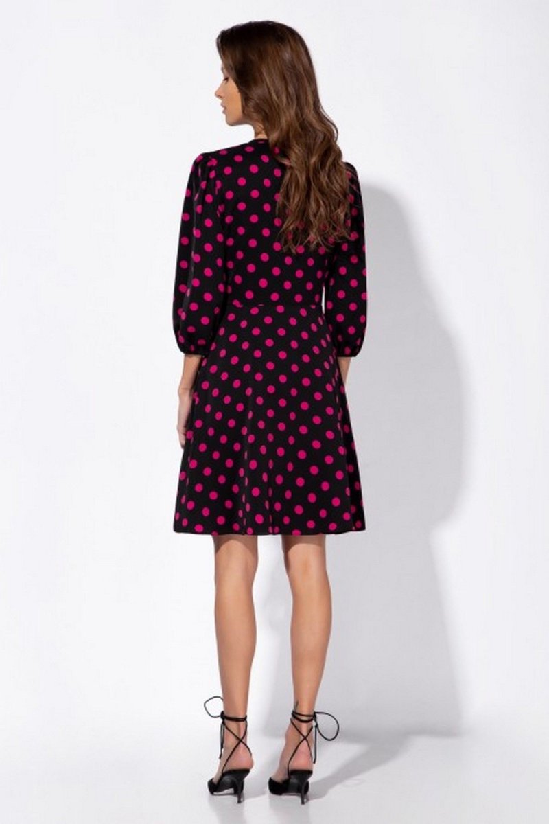 Платье женское, повседневное, полуприлегающего силуэта, длиной до коленей, с втачными рукавами, с подрезом на уровне линии талии, с застежкой на потайную тесьму-молнию в левом боковом шве. Лиф детали переда платья с втачным поясом фигурной формы; верхняя часть с талиевыми вытачками, со средним швом, вверху которого обработан разрез «V-образной» формы. Юбка платья расширенного силуэта, на подкладке, переднее полотнище со средним швом. Рукава втачные одношовные, длиной ¾, с притачными узкими манжетами, в которые вставлена эластичная тесьма. По окатам рукавов обработана сборка. Вырез горловины округлой формы, с втачной узкой бейкой, обработан обтачкой. Длина спинки – 92см.