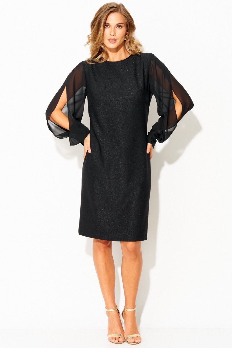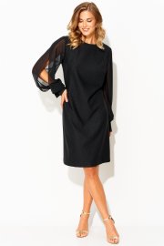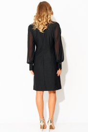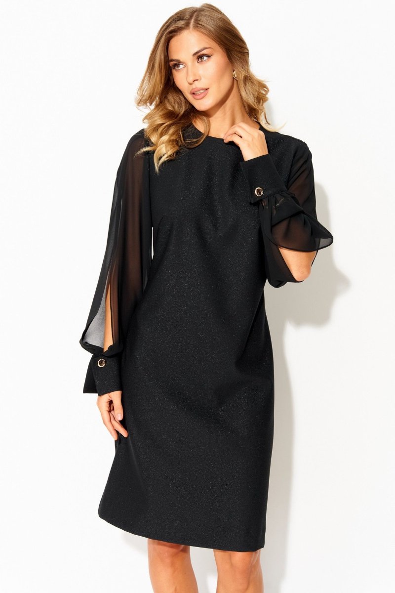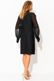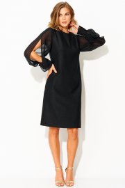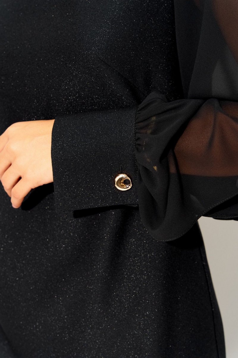 Вырез горловины округлой формы, застежка на потайную тесьму-молнию в среднем шве спинки. Деталь переда с нагрудными вытачками. Деталь спинки со средним швом и талиевыми вытачками. Рукава втачные из отделочной ткани, с вертикальным разрезом по центру. Рукава с притачными манжетами с застежкой на 1 петлю и пуговицу, по шву соединения обработана сборка.