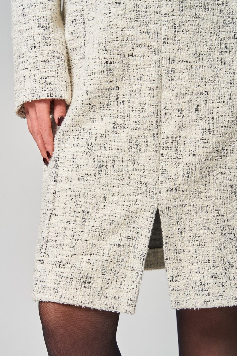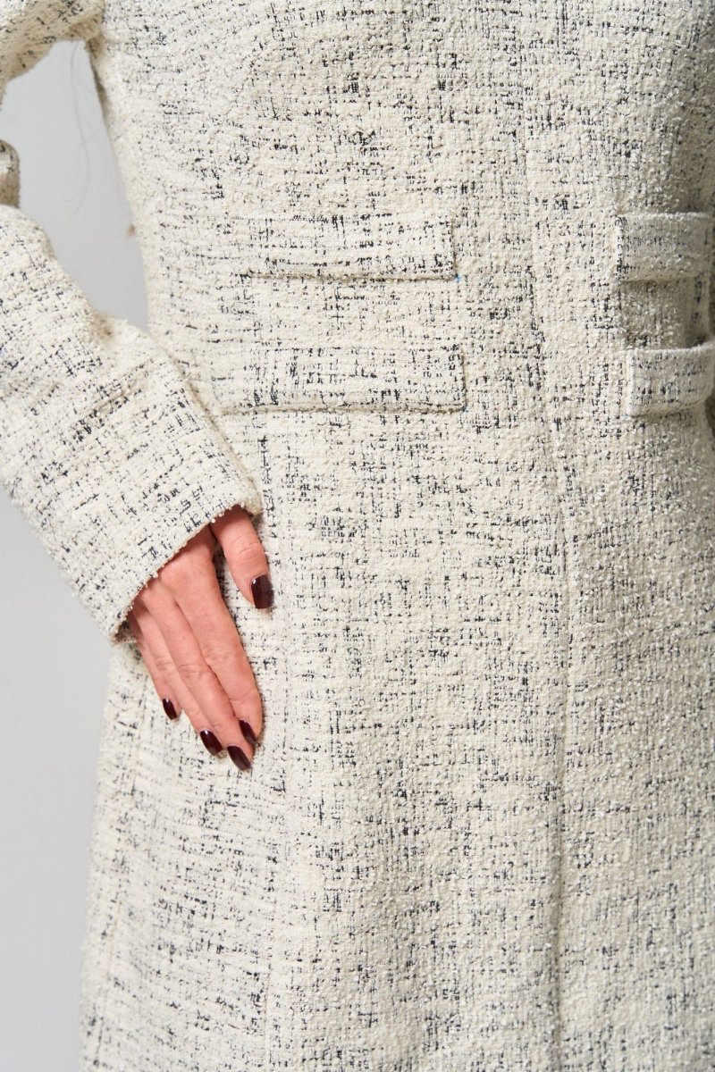 Детали переда платья с рельефными швами, исходящими от пройм до низа, со средним швом, который заканчивается разрезом V-образной формы сверху. На уровне линии талии настрочены по 2 листочки с каждой стороны. Спинка платья со средним швом. Рукава втачные двухшовные длинные.