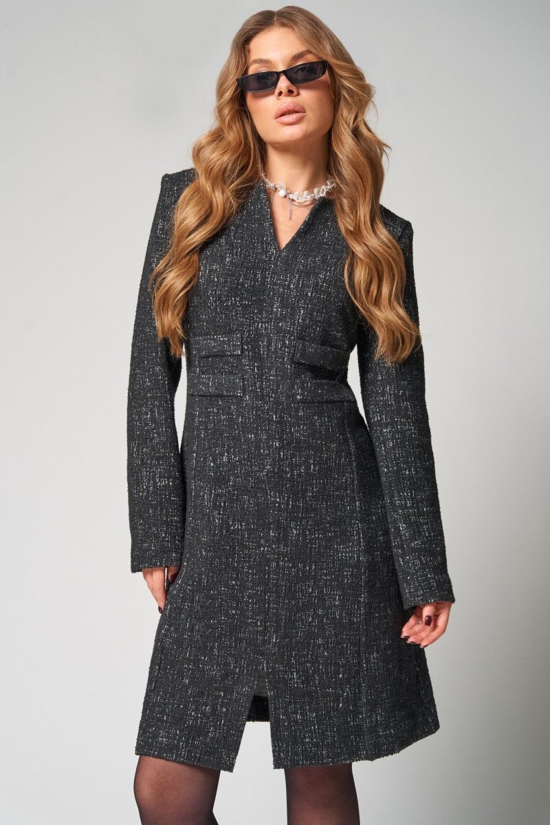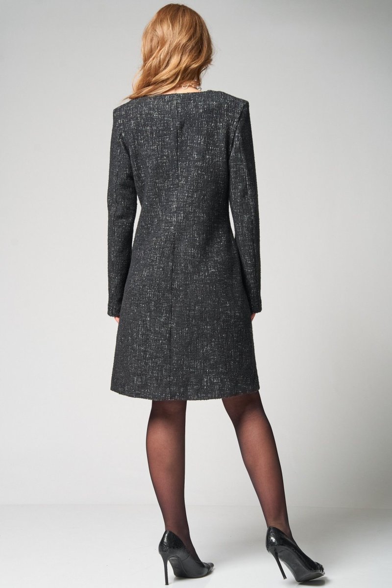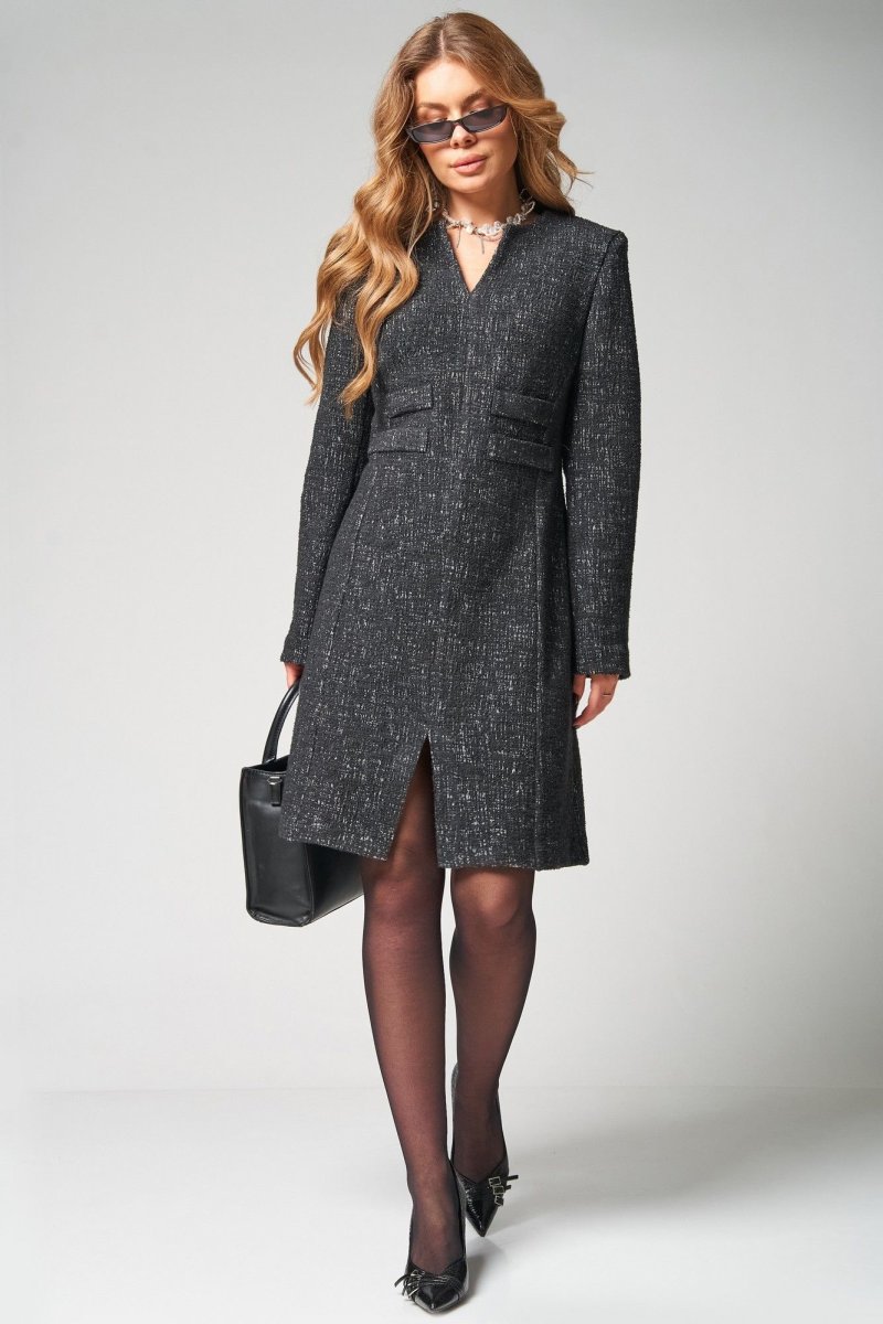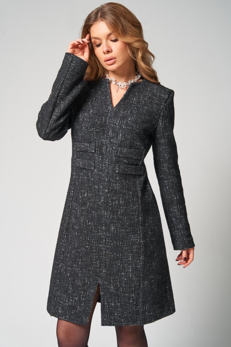 Детали переда платья с рельефными швами, исходящими от пройм до низа, со средним швом, который заканчивается разрезом V-образной формы сверху. На уровне линии талии настрочены по 2 листочки с каждой стороны. Спинка платья со средним швом. Рукава втачные двухшовные длинные.