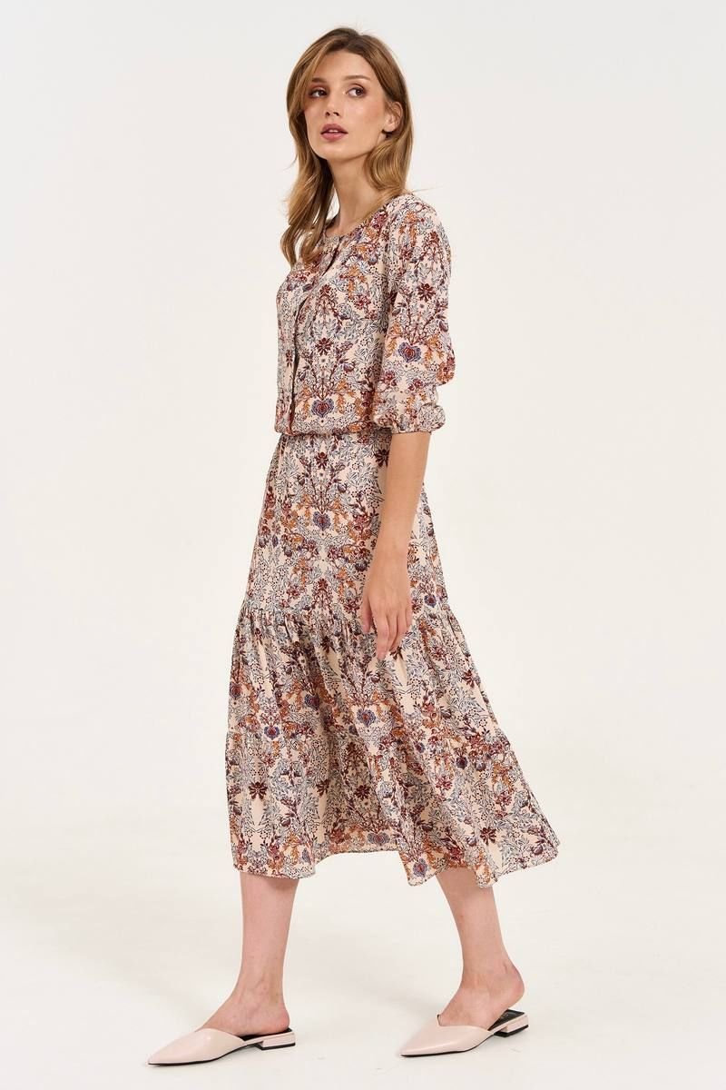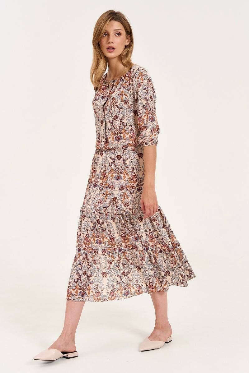 Платье женское легкое, шифоновое, удлиненное, без подкладки, свободного кроя. По переду и спинке отрезное по линии талии, по низу два волана со сборкой. Застежка до линии талии на обтяжные пуговицы и петли , под застежкой пришит тонкий поясок из основной ткани имитирующий затяжку кулисы. Рукав втачной, одношовный. По низу рукава и подрезу линии талии узкая резинка. Вырез горловины круглый, по горловине переда небольшая сборка. По правой стороне волана переда - разрез, который придает этому легкому платью еще больше женственности и кокетливости.