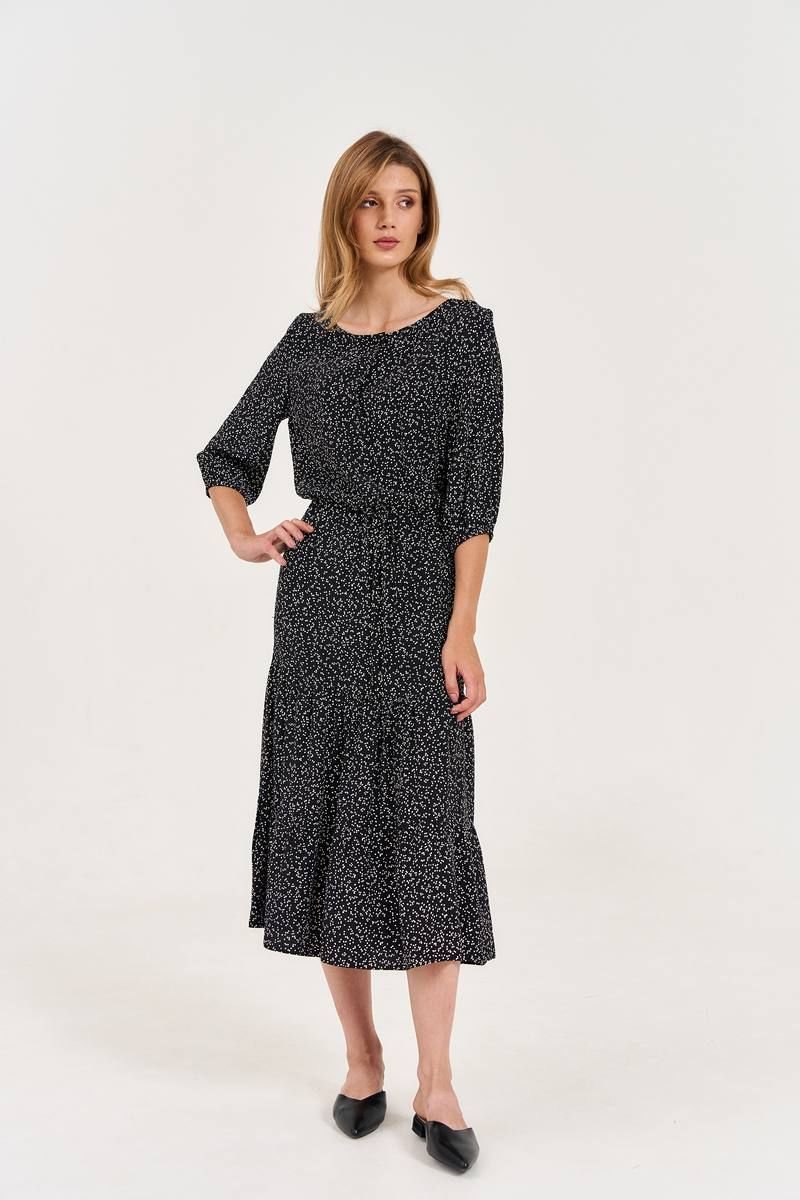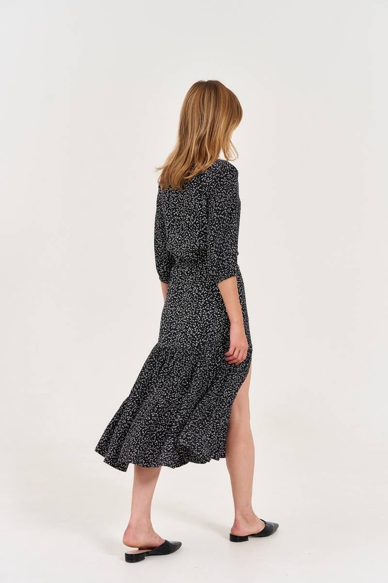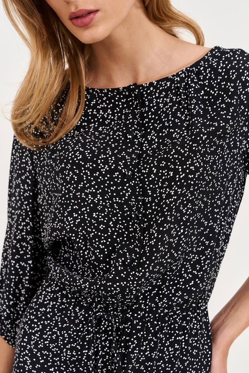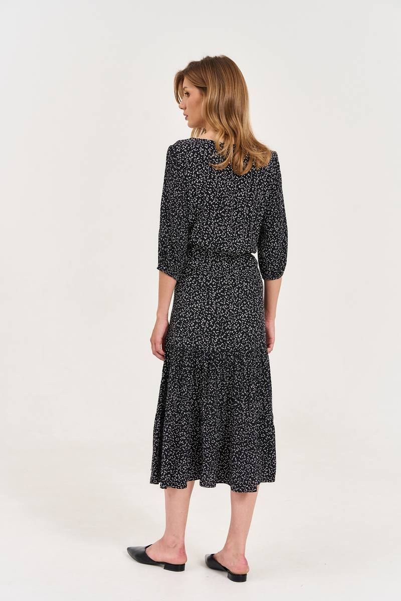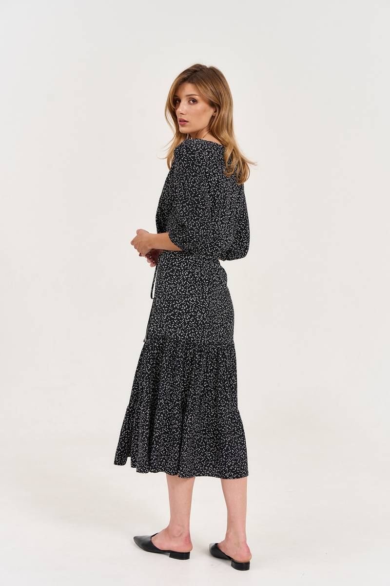 Платье женское легкое, удлиненное, без подкладки, свободного кроя. По переду и спинке отрезное по линии талии, по низу два волана со сборкой. Застежка до линии талии на обтяжные пуговицы и петли , под застежкой пришит тонкий поясок из основной ткани имитирующий затяжку кулисы. Рукав втачной, одношовный. По низу рукава и подрезу линии талии узкая резинка. Вырез горловины круглый, по горловине переда небольшая сборка. По правой стороне волана переда - разрез, который придает этому легкому платью еще больше женственности и кокетливости.
