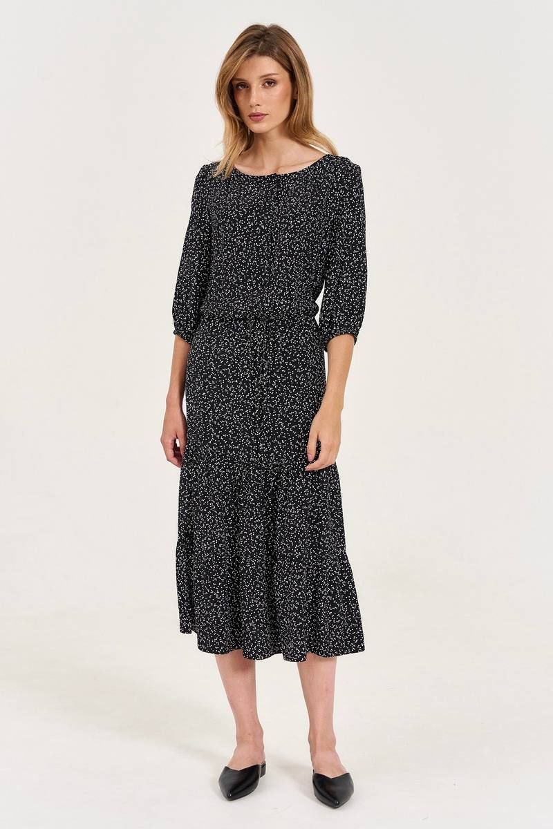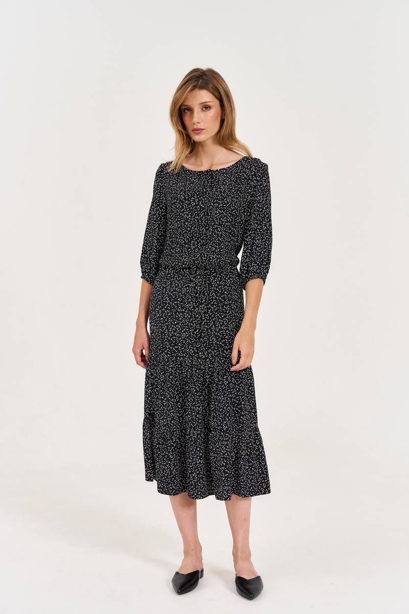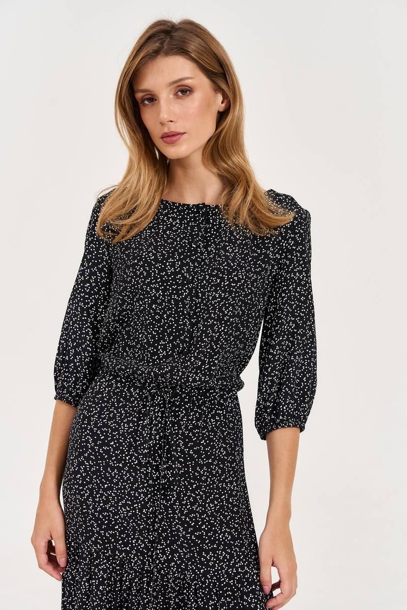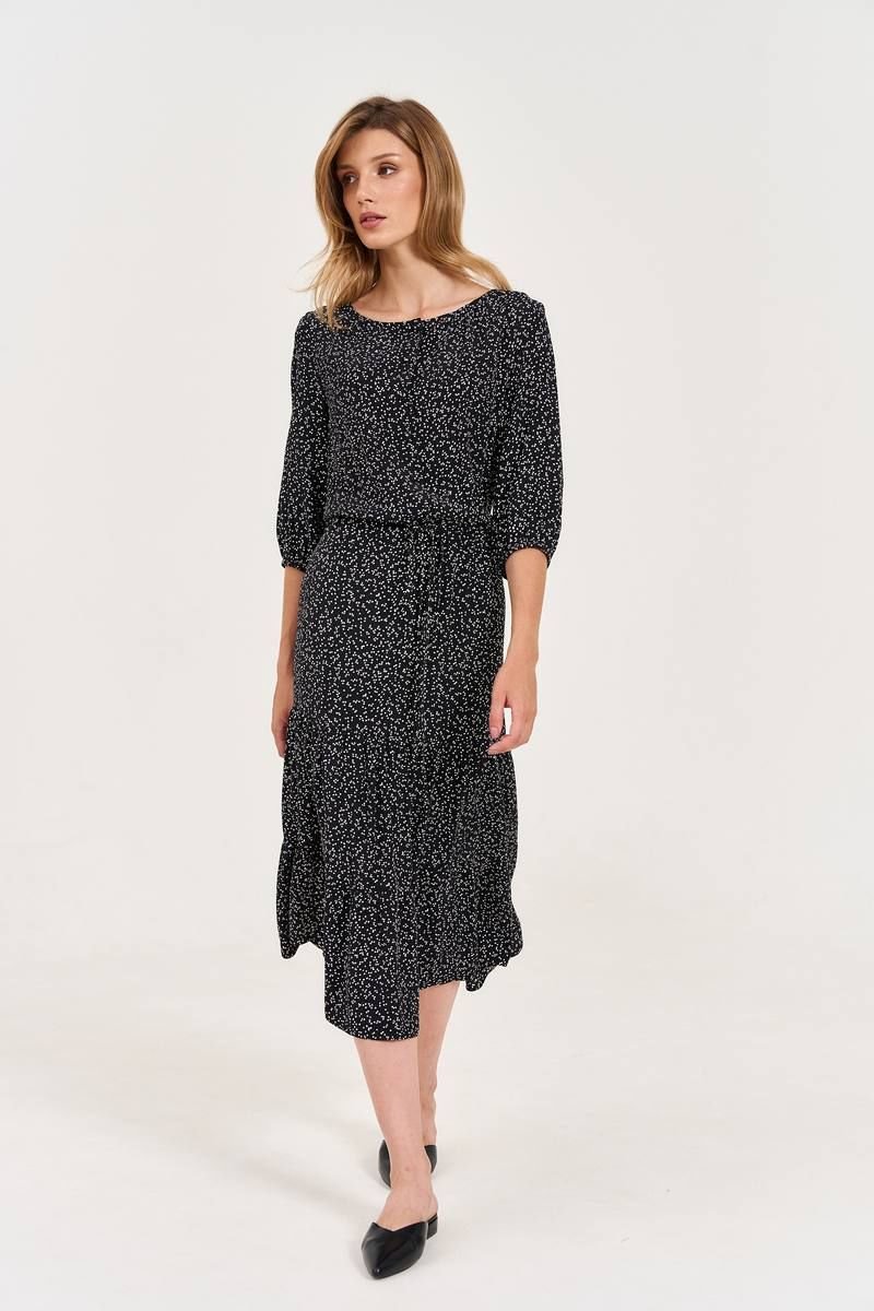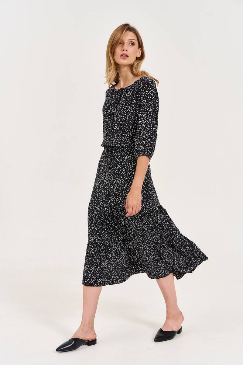 Платье женское легкое, удлиненное, без подкладки, свободного кроя. По переду и спинке отрезное по линии талии, по низу два волана со сборкой. Застежка до линии талии на обтяжные пуговицы и петли , под застежкой пришит тонкий поясок из основной ткани имитирующий затяжку кулисы. Рукав втачной, одношовный. По низу рукава и подрезу линии талии узкая резинка. Вырез горловины круглый, по горловине переда небольшая сборка. По правой стороне волана переда - разрез, который придает этому легкому платью еще больше женственности и кокетливости.