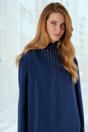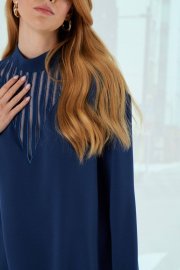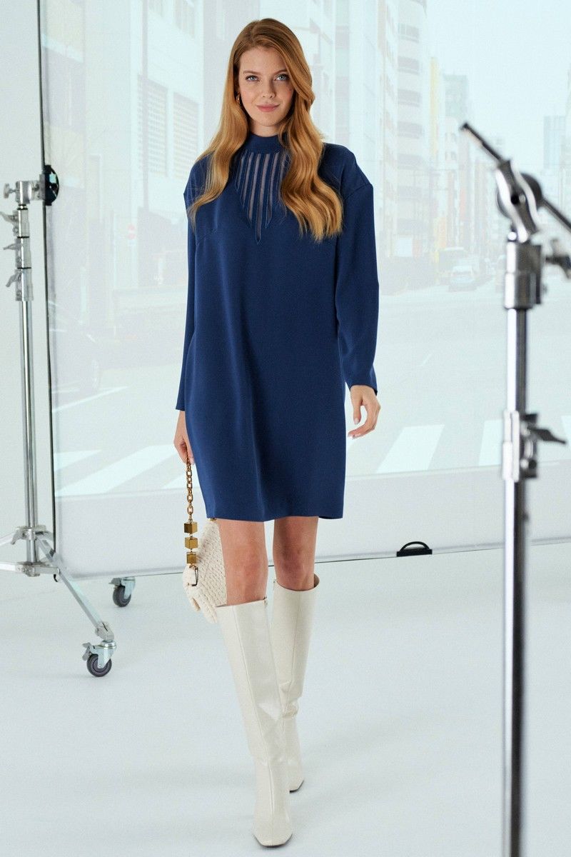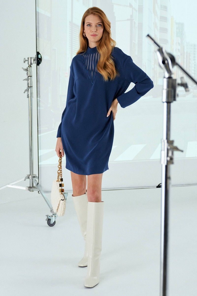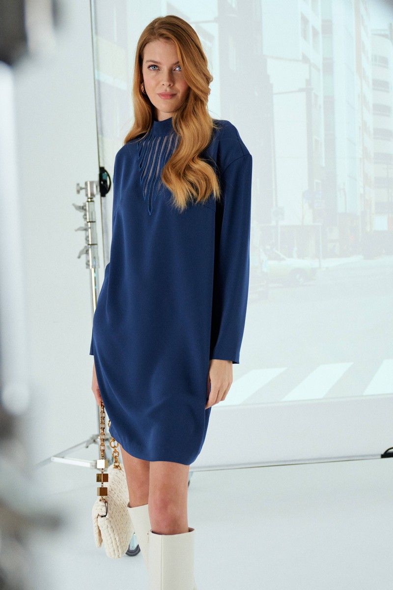 Платье выполнено из вискозной ткани. Платье прямого силуэта. Рукав длинный, линия плеча спущенная, воротник стойка. В среднем шве спинки расположена застежка на тесьму-молнию. По переду платья выполнена декоративная вышивка с сеткой. Платье имеет длину до линии колена. Длина платья по спинке: 90 см Длина рукава от горловины: 52 см Обхват груди: 106-110-114-118 см (размер 42-44-46-48) Обхват бедер: 108-112-116-120 см (размер 42-44-46-48)