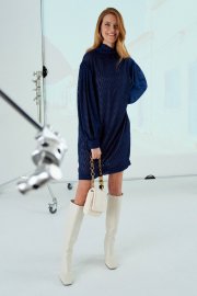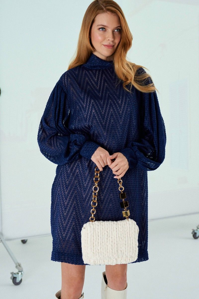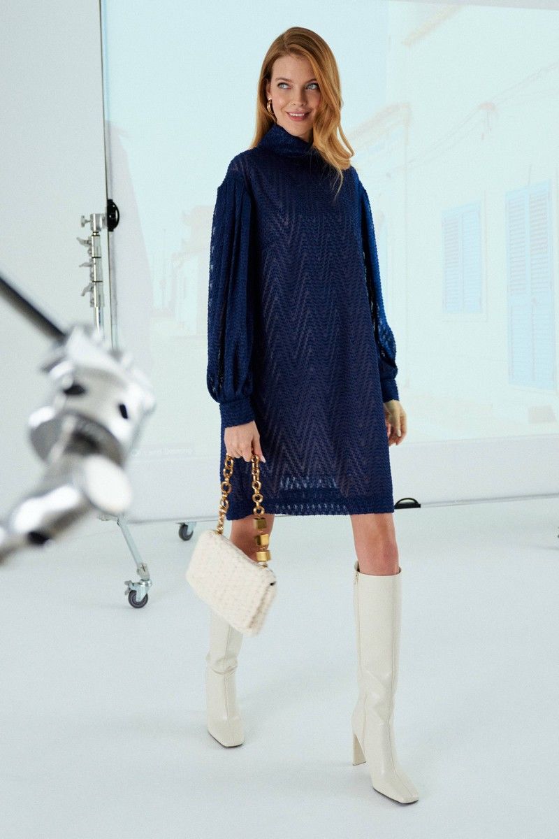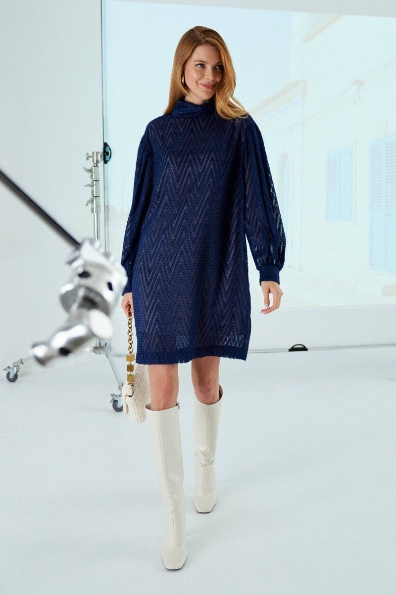 Платье силуэта «кокон». Имеет спущенную линию плеча, рукав длинный со сборкой по плечу и с манжетой по низу. В среднем шве спинки застежка на навесные петли-пуговицы. Воротник-стойка. Имеет второе платье-комбинацию на бретелях. Длина платья по спинке от втачивания воротника: 90 см Обхват груди: 108-112-116 см (размер 44-46-48) Обхват бедер: 110-114-118 см (размер 44-46-48)