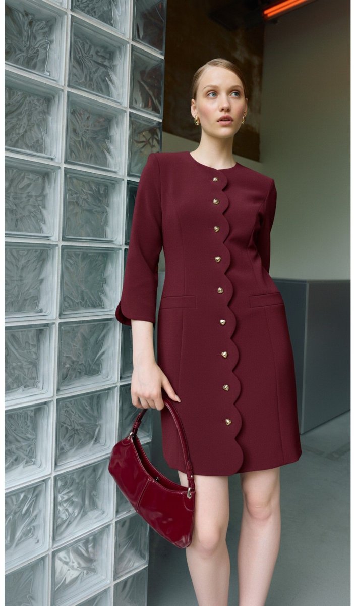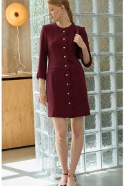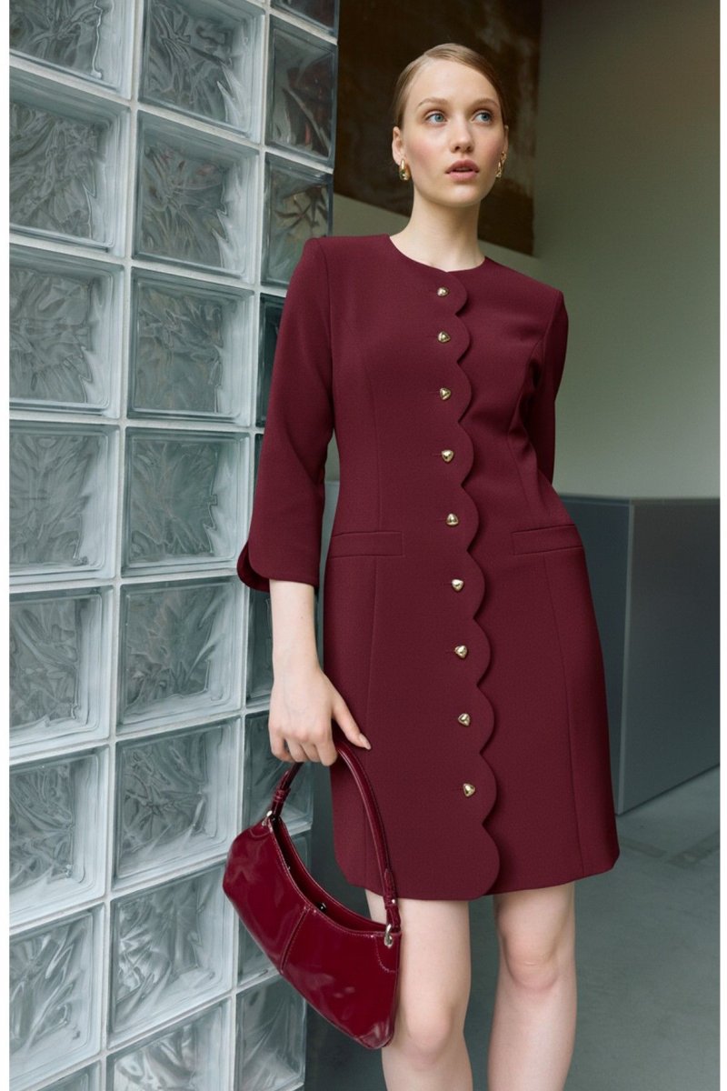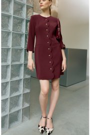 Платье полуприлегающего силуэта, по переду и спинке на подкладке. Рукав втачной ¾, по низу фигурный. Округлый вырез горловины, застежка центральная на петли и пуговицы, борт фигурной формы. По вертикальный рельефы и прорезные карманы. По спинке средний шов и вертикальные рельефы.