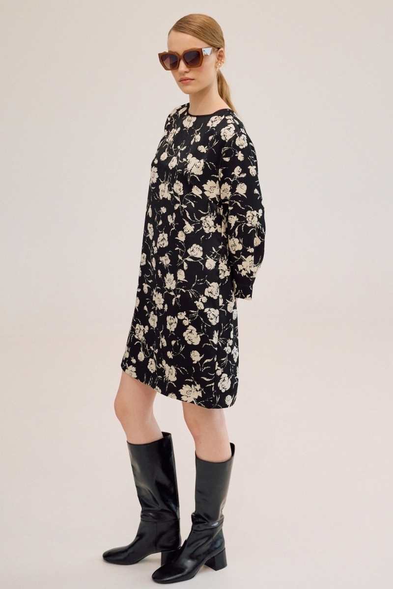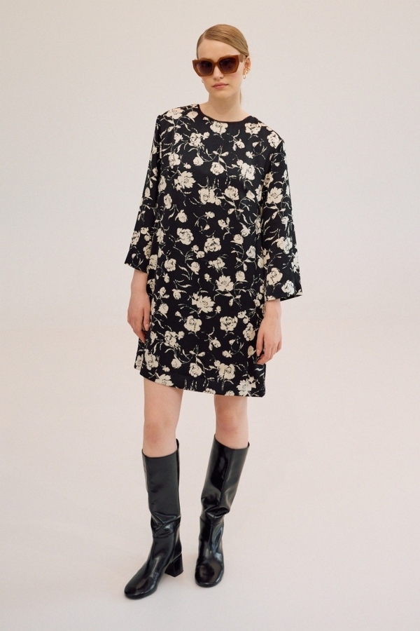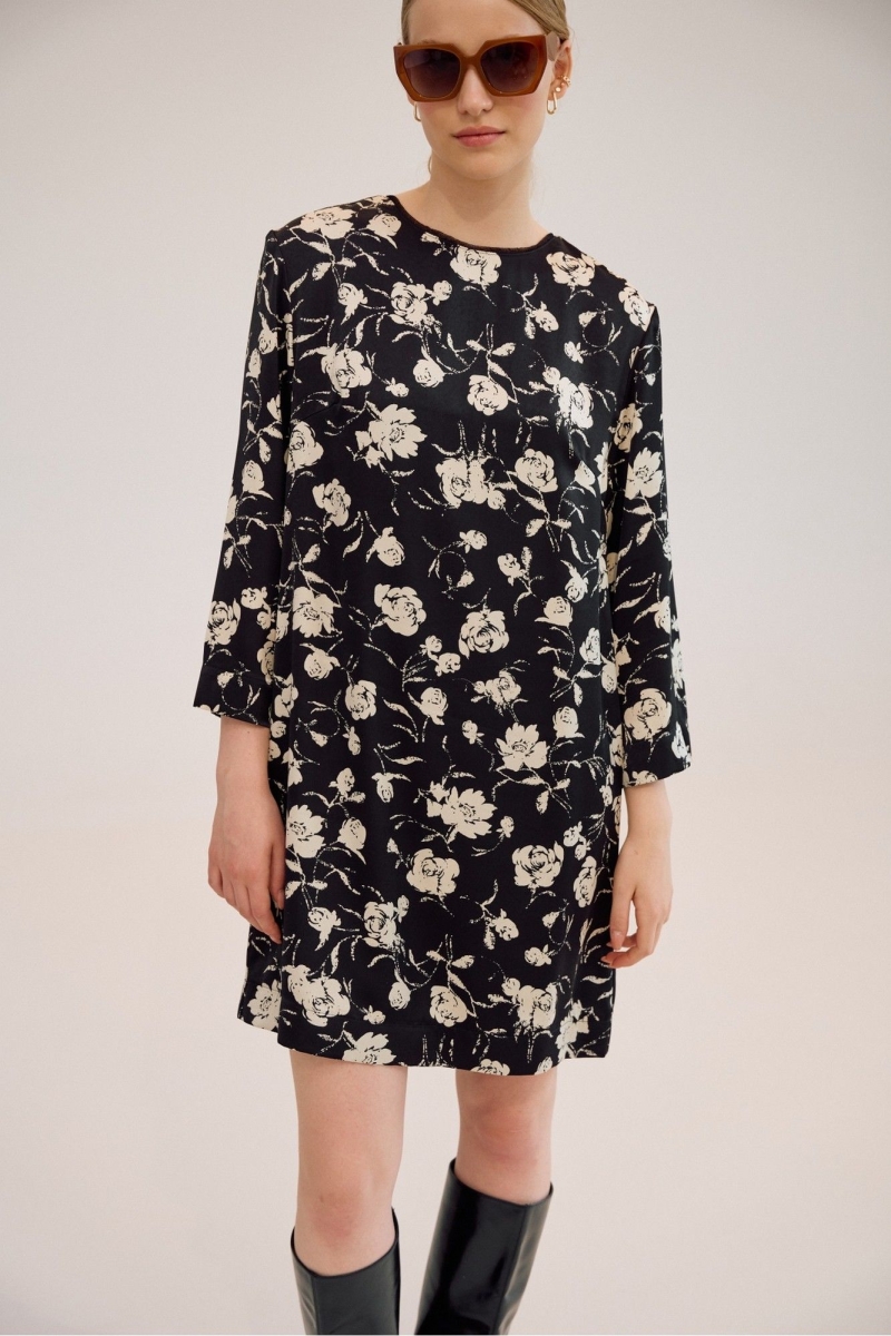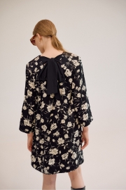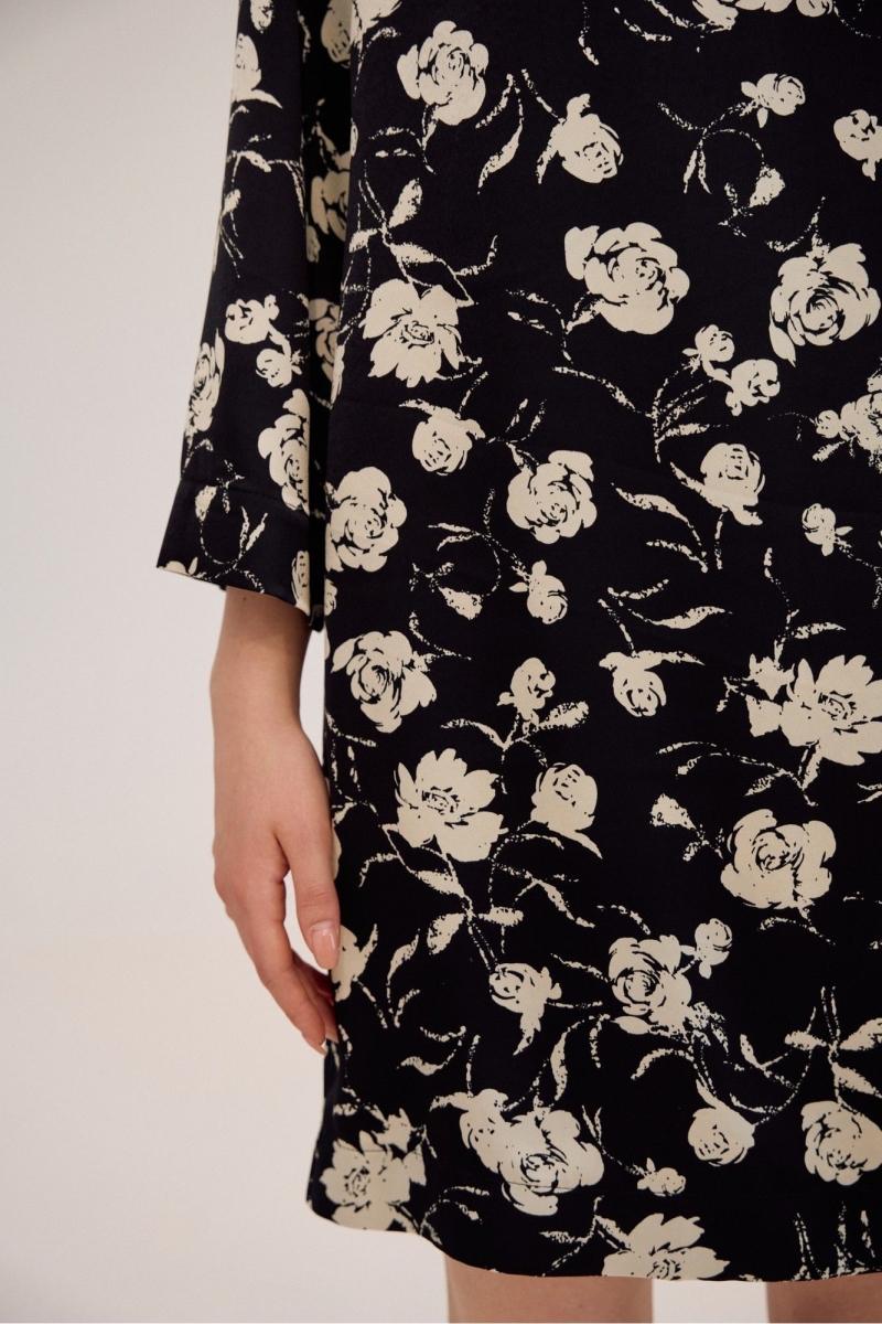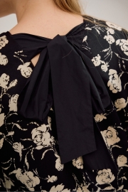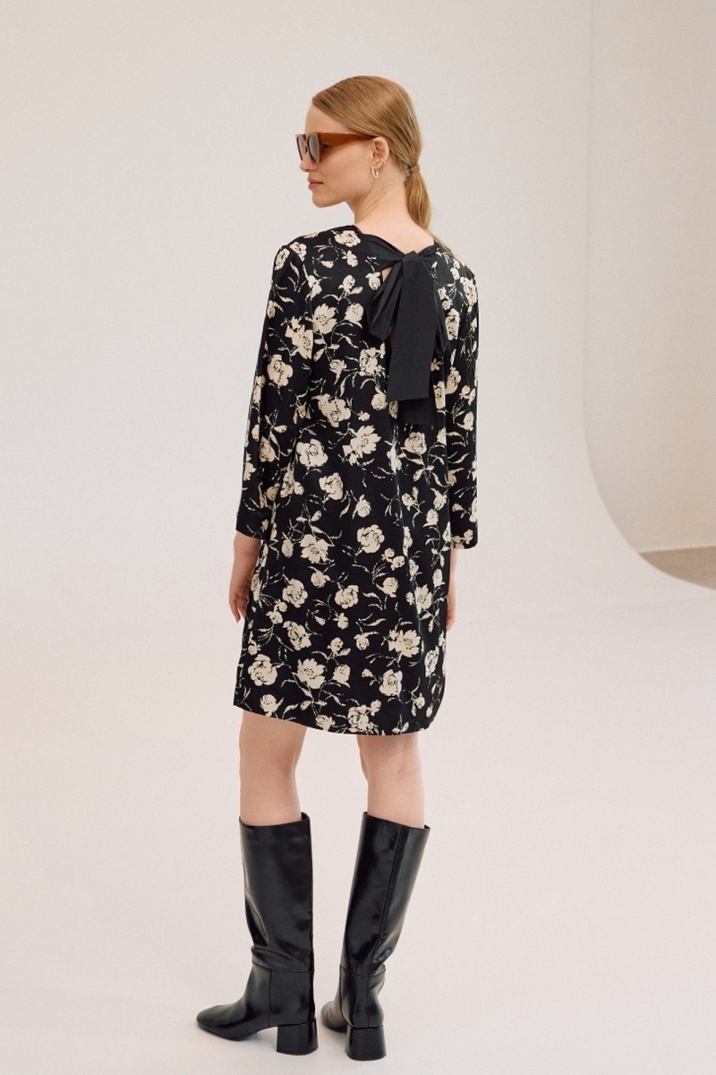 Платье свободного кроя на подкладке, выполнено из плательной ткани. Рукав три четверти, линия плеча спущена. По переду округлый вырез горловины, декорированный сеткой. По спинке средний шов, V-образный вырез горловины, с завязкой на бант. Платье: Длина по спинке от высшей точки горловины: 90 см Длина рукава: 49 см ОГ: 96-100-104-108 см (размер 42-44-46-48) ОТ: 94-98-102-106 см (размер 42-44-46-48) ОБ: 106-110-114-118 см (размер 42-44-46-48)