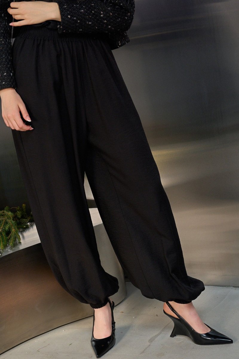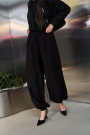 Брюки-алладины свободного кроя. По линии на резинке. По низу брюк также резинка. В боковых швах карманы.