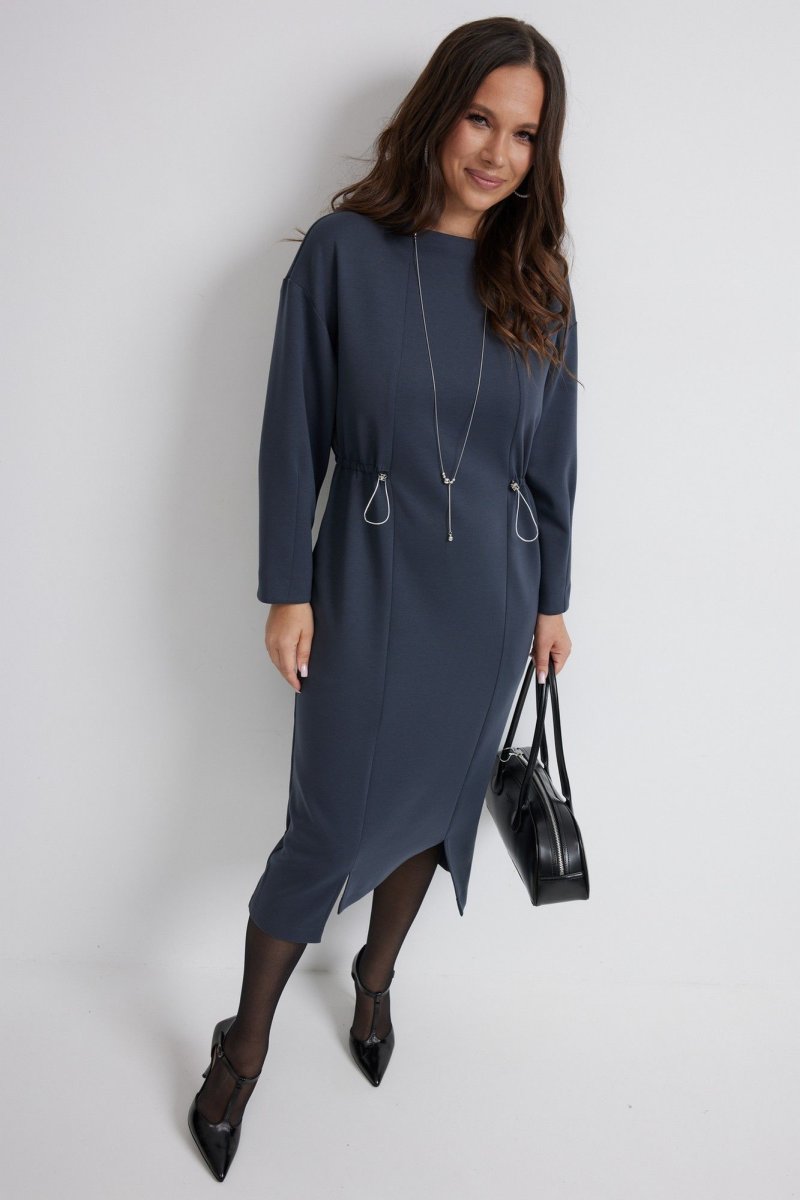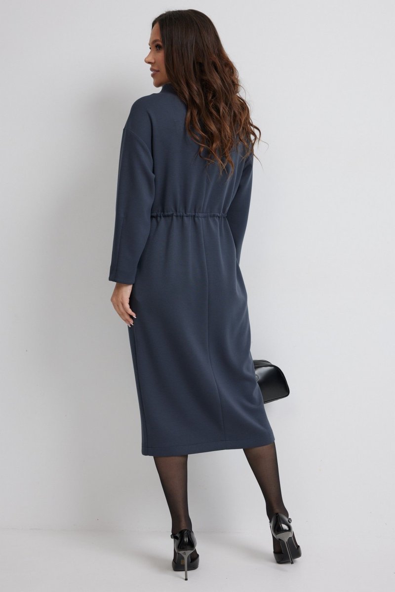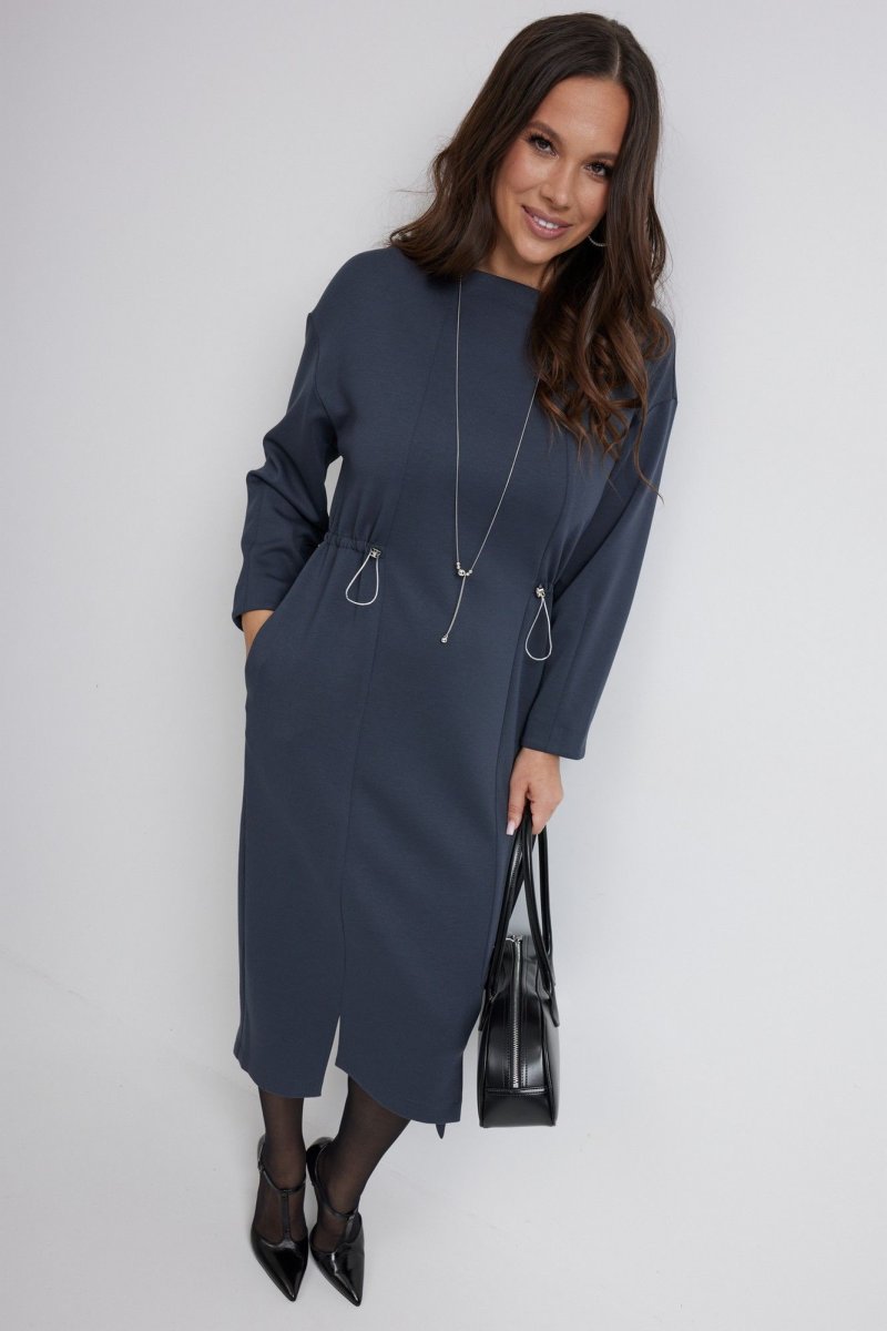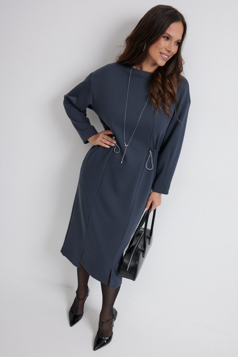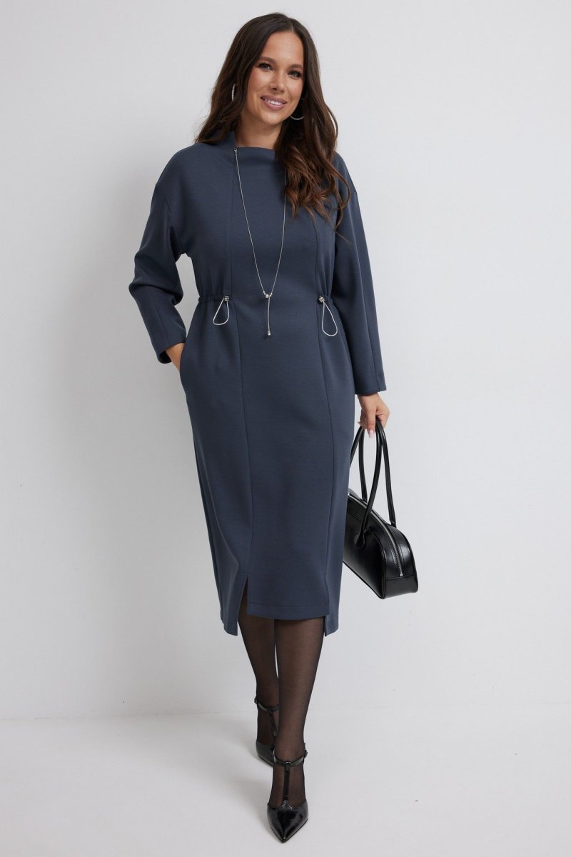Стильное платье полуприлегающего силуэта. Выполнено из приятного к телу гладкого трикотажного полотна. Рукав длинный, слегка спущен. Цельнокроеная горловина полустойка образует красивый вырез. Платье приталено за счет скрытой кулиски с эластичной тесьмой с фиксаторами серебристого цвета. Так же платье дополнено съемным украшением из цепочек. В боковых швах расположены удобные карманы. Длина рукава 60 см. Длина платья от плечевого шва 119 см.