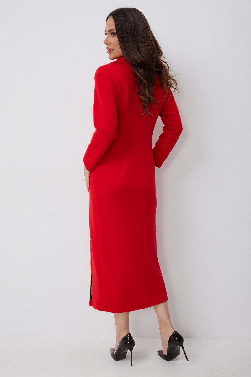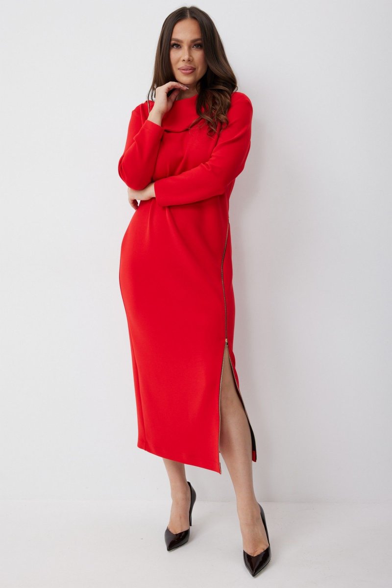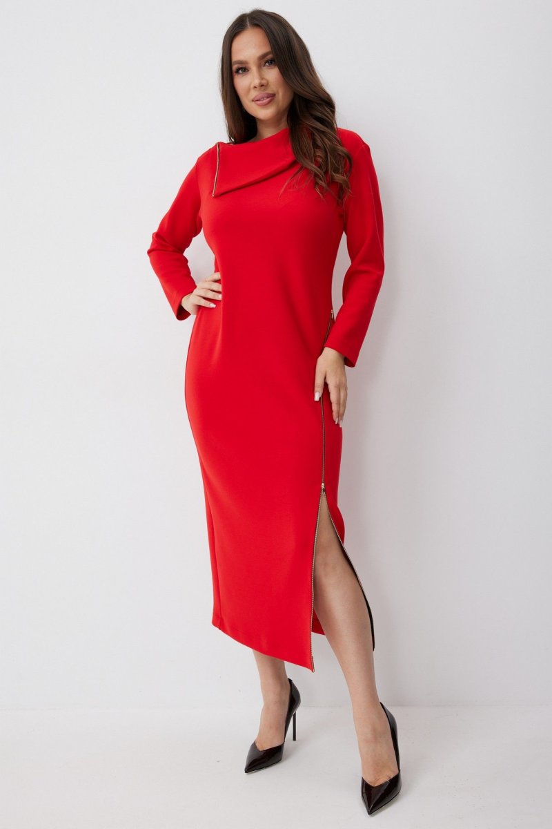 Элегантное и стильное платье миди полуприлегающего силуэта. Выполнено из приятного к телу комфортного гладкого трикотажного полотна. Рукав втачной, полной длины. Украшением платья являются функциональные тесьмы молнии. С их помощью можно стильно уложить воротник и отрегулировать вырез платья. Из лаконичного базового платье легко трансформируется в стильное и сексуальное. Длина платья от плечевого шва 127см. Длина рукава 60см.