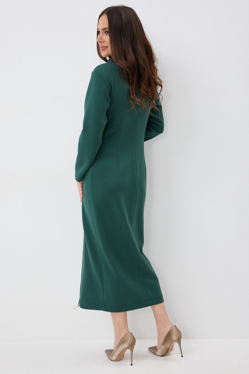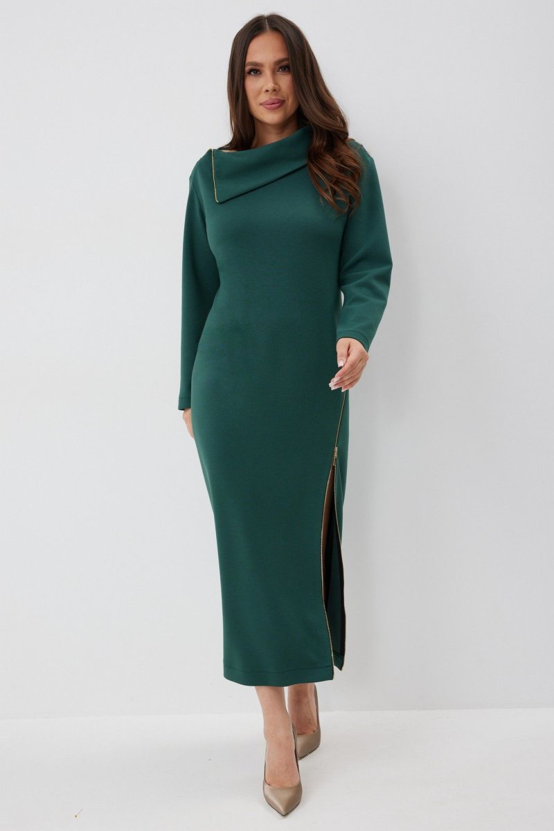 Элегантное и стильное платье миди полуприлегающего силуэта. Выполнено из приятного к телу комфортного гладкого трикотажного полотна. Рукав втачной, полной длины. Украшением платья являются функциональные тесьмы молнии. С их помощью можно стильно уложить воротник и отрегулировать вырез платья. Из лаконичного базового платье легко трансформируется в стильное и сексуальное. Длина платья от плечевого шва 127см. Длина рукава 60см.