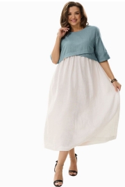 Платье с завышенной линией талии. По низу полочки декоративная горизонтальная складка. Рукав короткий прямой. Горловина округлой формы, сзади застегивается на пуговицу и воздушную петлю. Юбка присборенная, на подкладке, карманы в боковых швах.
