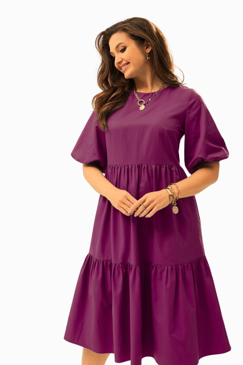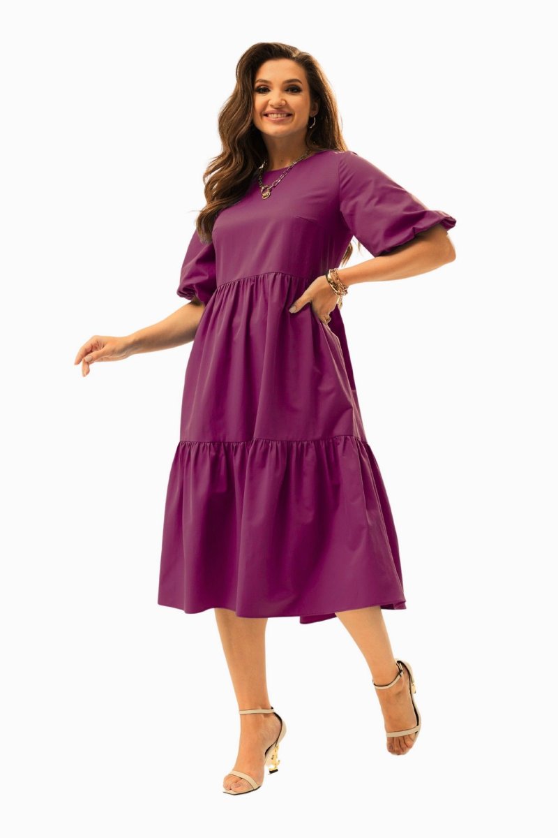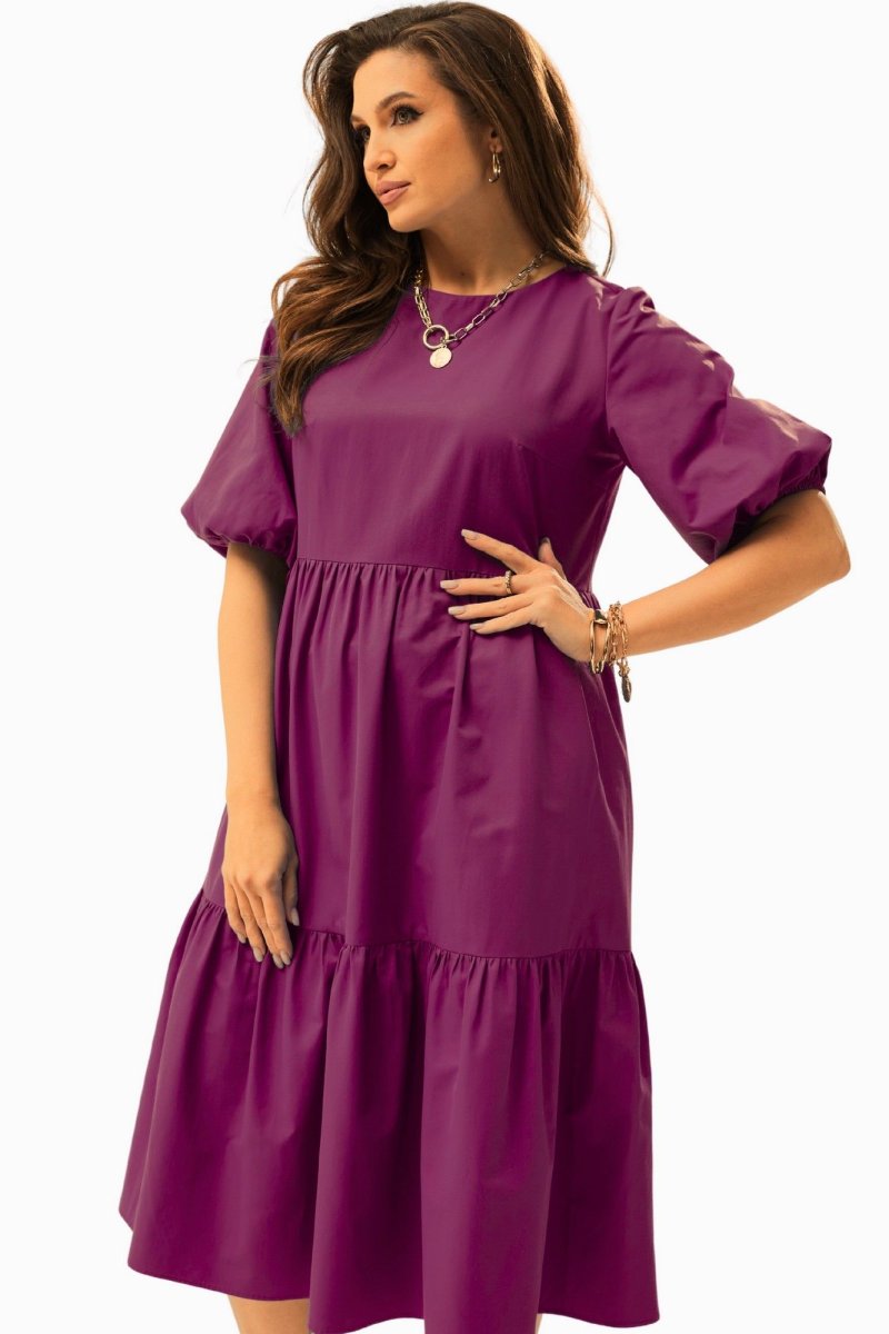 Платье А-силуэта с завышенной талией. Горловина округлой формы. Рукав расширенный к низу, на резинке. Спинка со средним швом с застежкой на воздушную петлю и пуговицу. Юбка состоит из двух объемных присборенных воланов