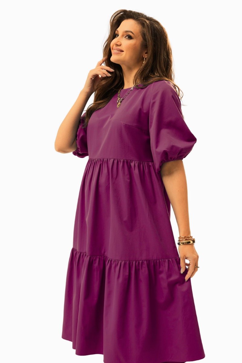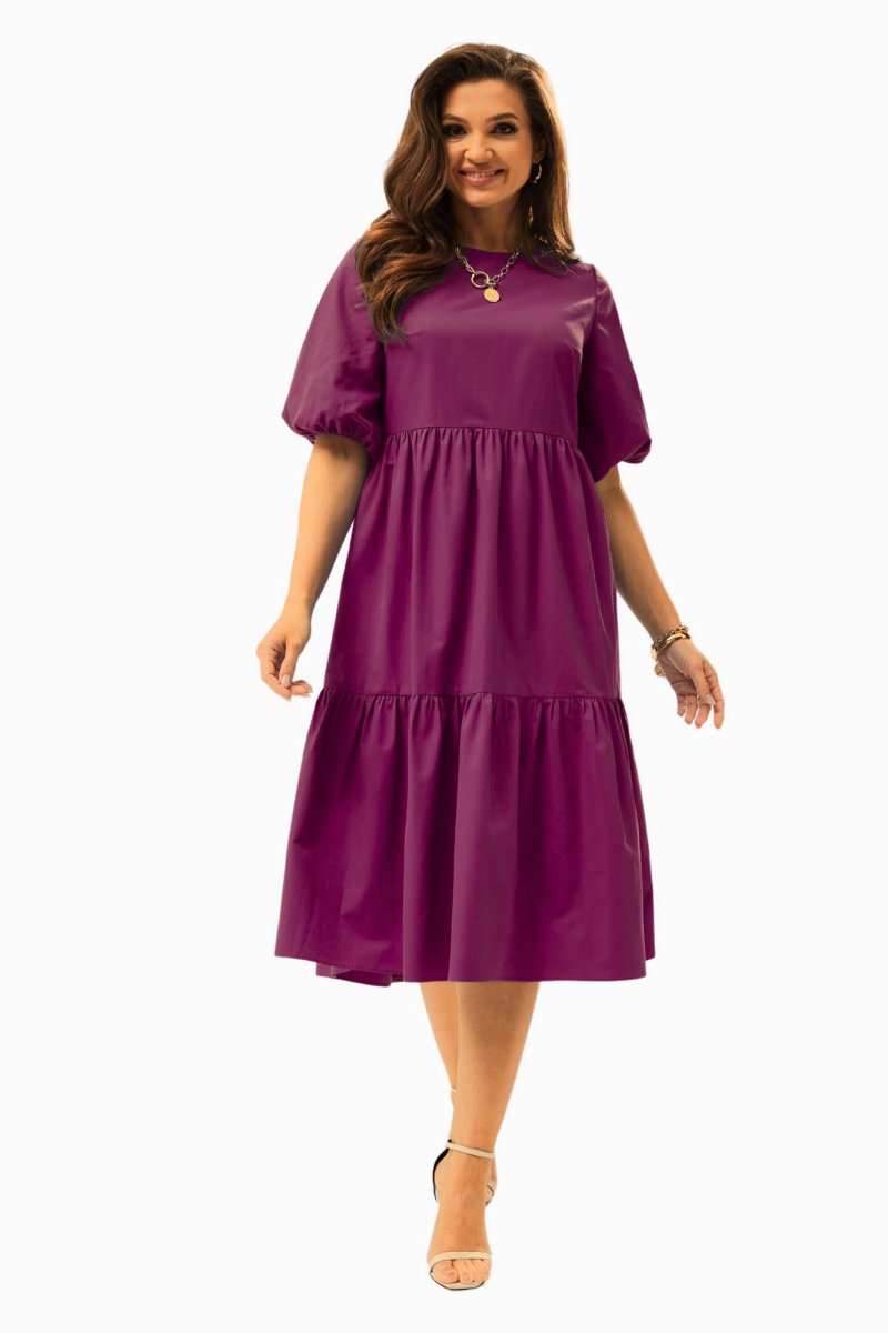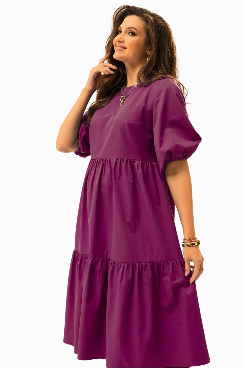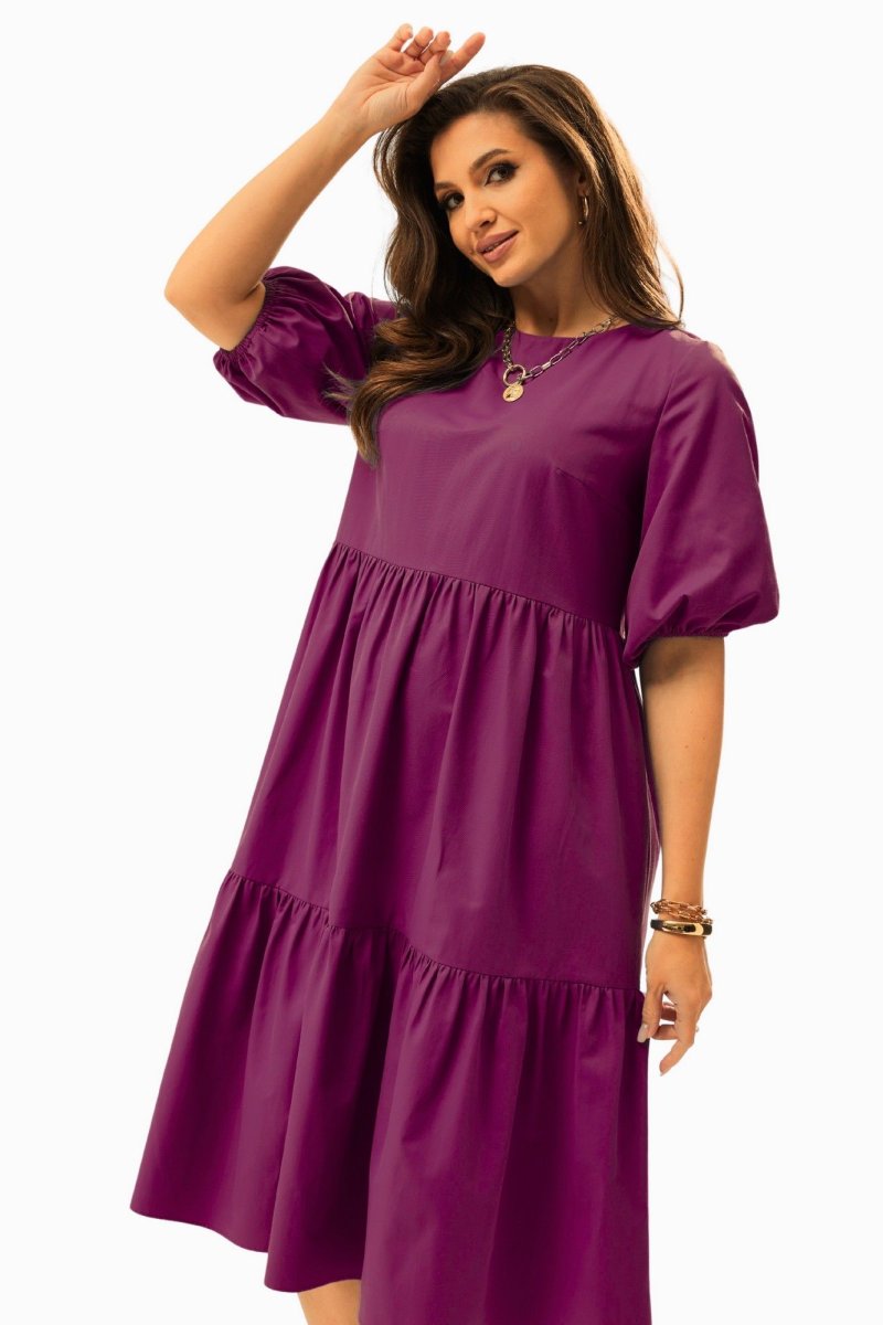 Платье А-силуэта с завышенной талией. Горловина округлой формы. Рукав расширенный к низу, на резинке. Спинка со средним швом с застежкой на воздушную петлю и пуговицу. Юбка состоит из двух объемных присборенных воланов