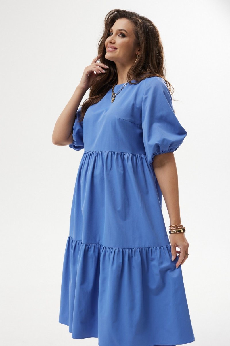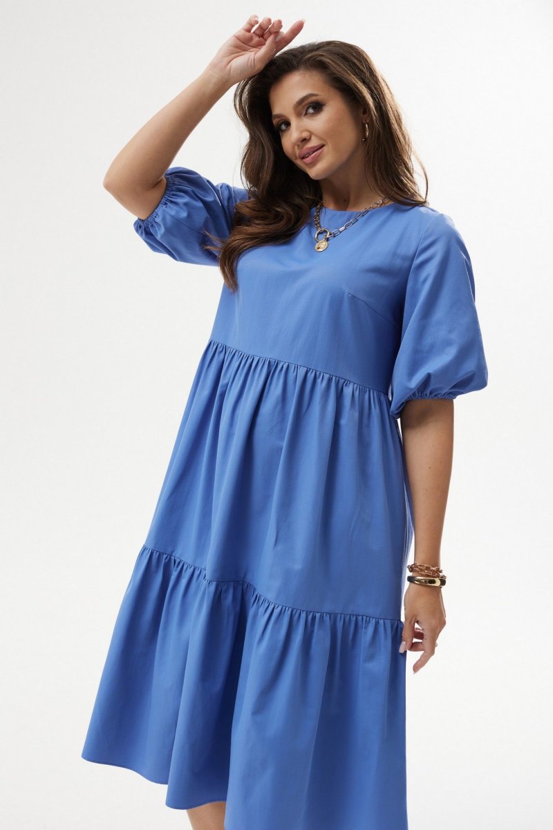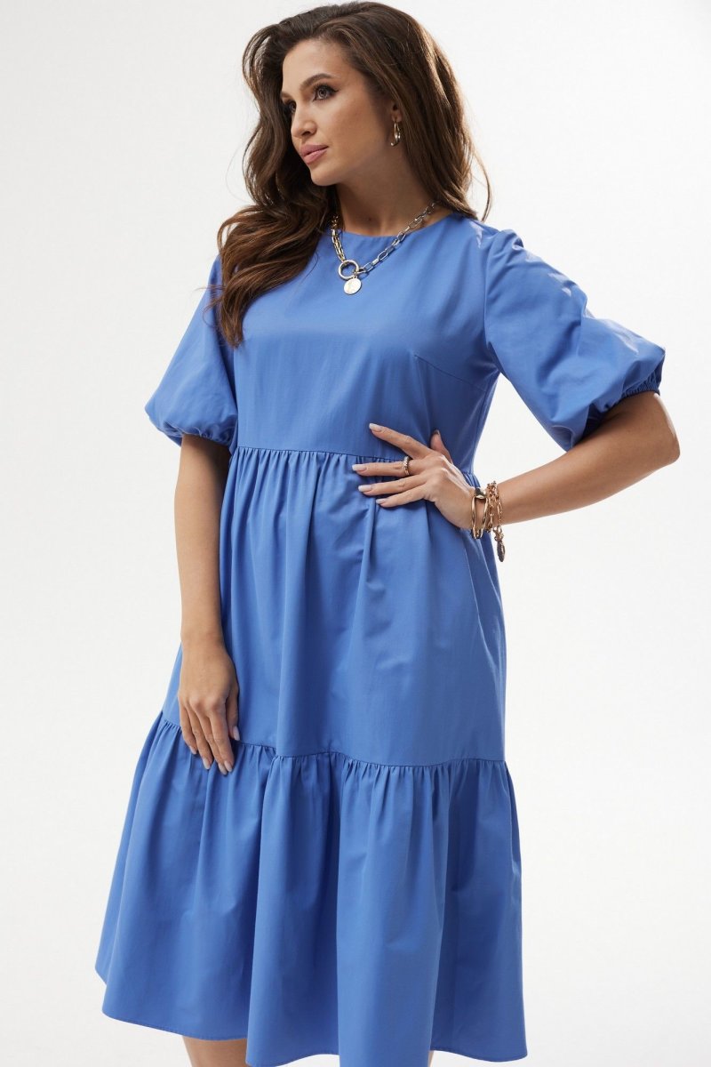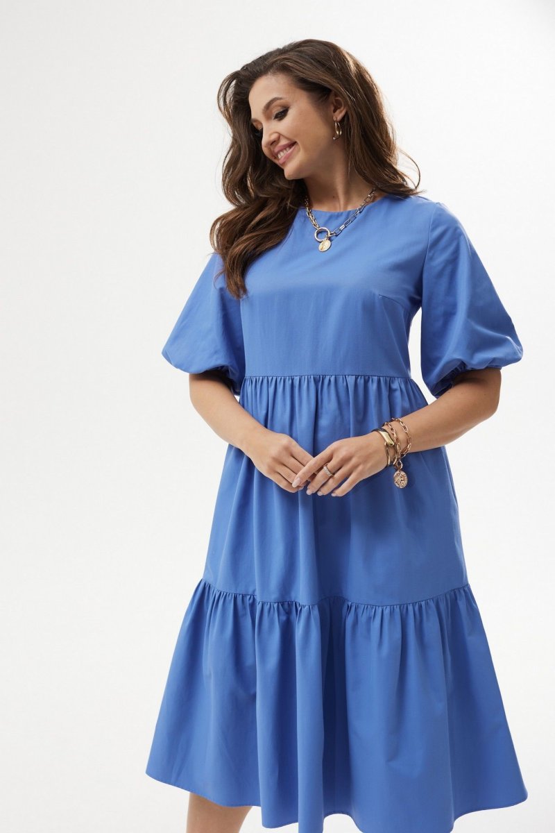 Платье А-силуэта с завышенной талией. Горловина округлой формы. Рукав расширенный к низу, на резинке. Спинка со средним швом с застежкой на воздушную петлю и пуговицу. Юбка состоит из двух объемных присборенных воланов