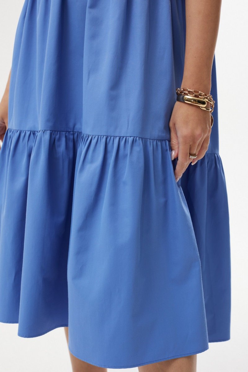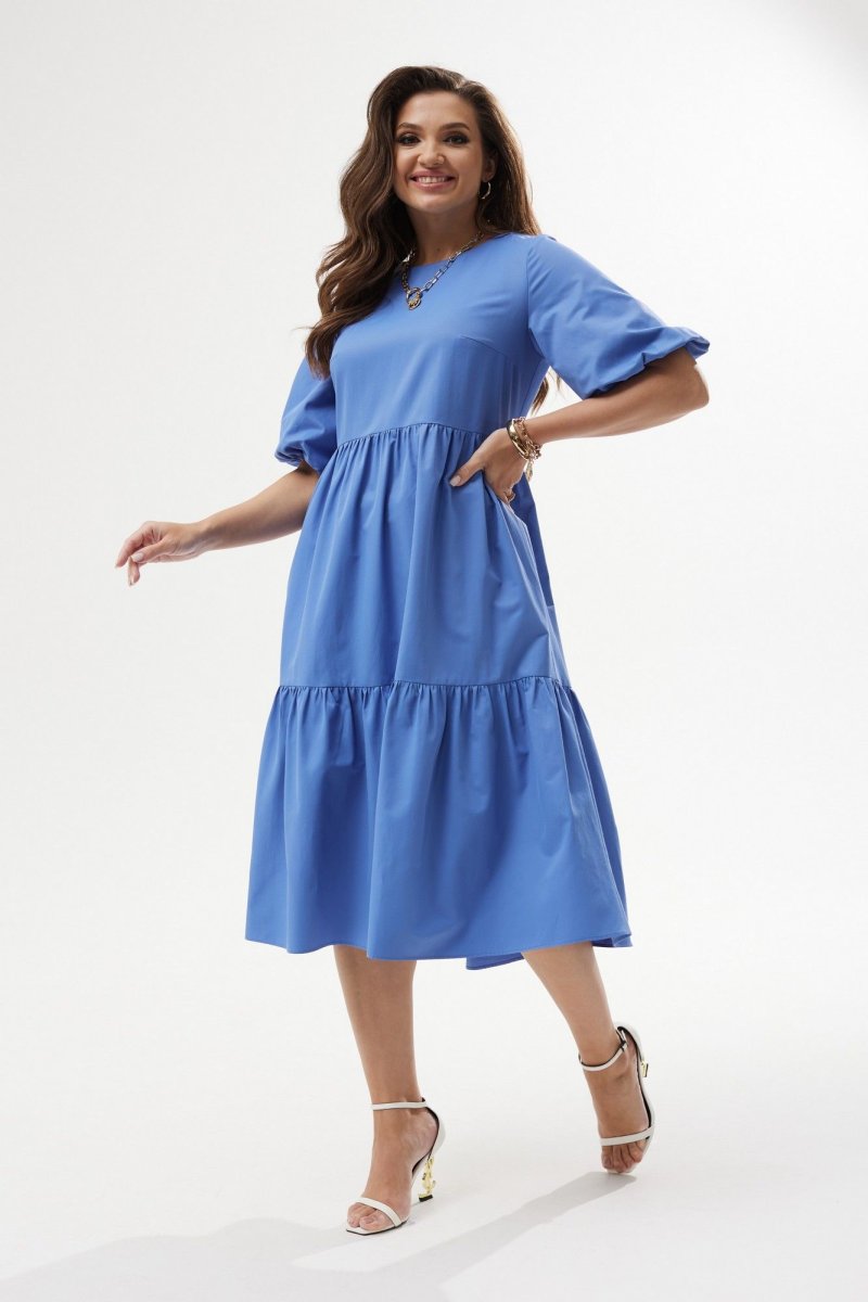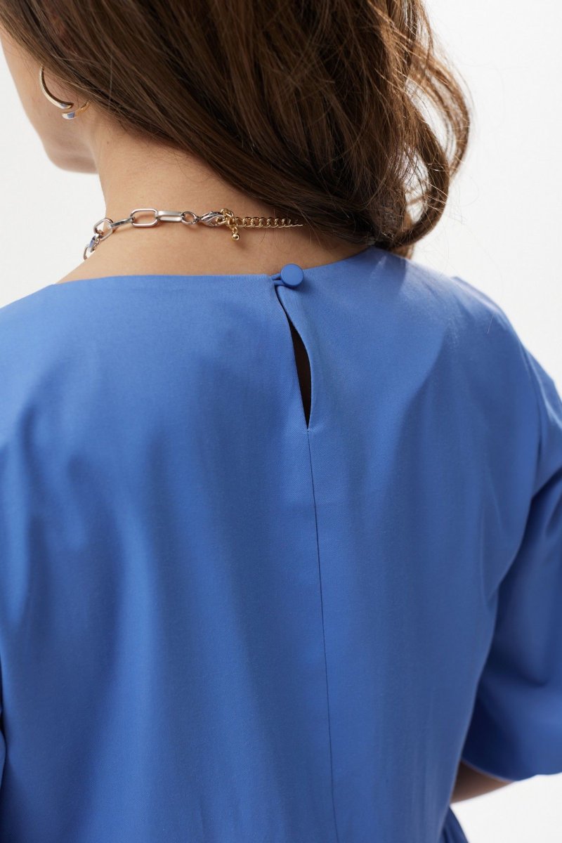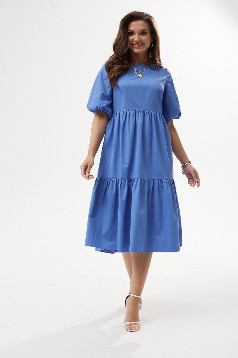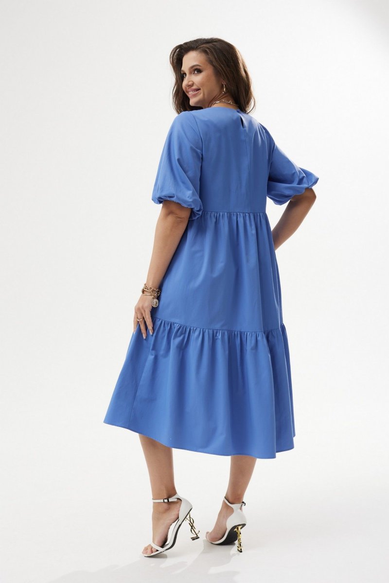 Платье А-силуэта с завышенной талией. Горловина округлой формы. Рукав расширенный к низу, на резинке. Спинка со средним швом с застежкой на воздушную петлю и пуговицу. Юбка состоит из двух объемных присборенных воланов