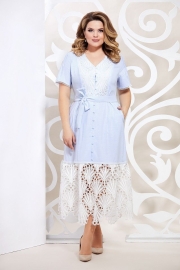Летнее платье полуприлегающего силуэта, со слегка расширенной к низу юбкой выполнено из хлопковой ткани и кружева. Платье отрезное по линии талии, с мягким поясом, завязывающимся на бант. Платье с рельефами по лифу и с центральной застежкой на навесные петли и пуговицы. Центральная часть платья по лифу из кружева поверх основной ткани. Платье с карманами и декоративными защипами по юбке. Юбка платья с нижним воланом из кружева на просвет. Шов притачивания волана декорирован настроченной тесьмой. Рукав платья втачной, короткий, слегка расширен к низу, с защипами по центральной части. Низ рукава декорирован притачной тесьмой.
