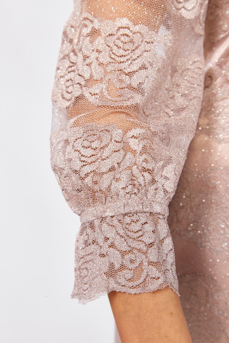 Нарядное женское платье полуприлегающего силуэта, выполнено из гипюра с глитером и текстиля. Лиф платья отрезной по линии талии, с вытачками, на лифе обработана застежка на петли-пуговицы. Юбка платья прямого покроя, выполнена из гипюра с глитером. Спинка выполнена из однотона (текстиля), со средним швом и вытачками, в среднем шве по низу шлица. Рукав выполнен из гипюра с глитером, расклешенный к низу и присборен на манжет из гипюра. Элегантное платье отличный выбор для вашего образа на любое мероприятие!