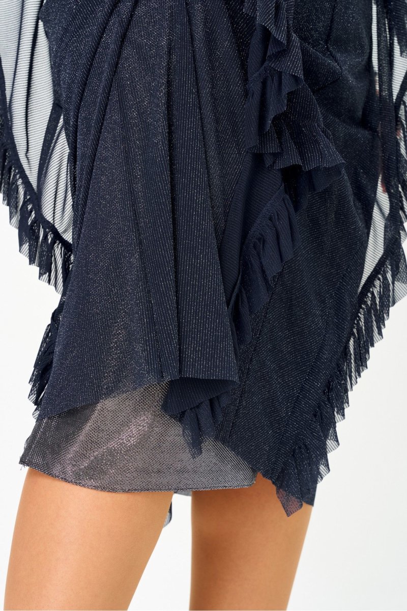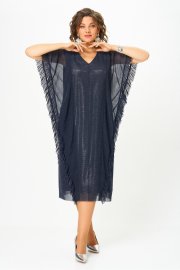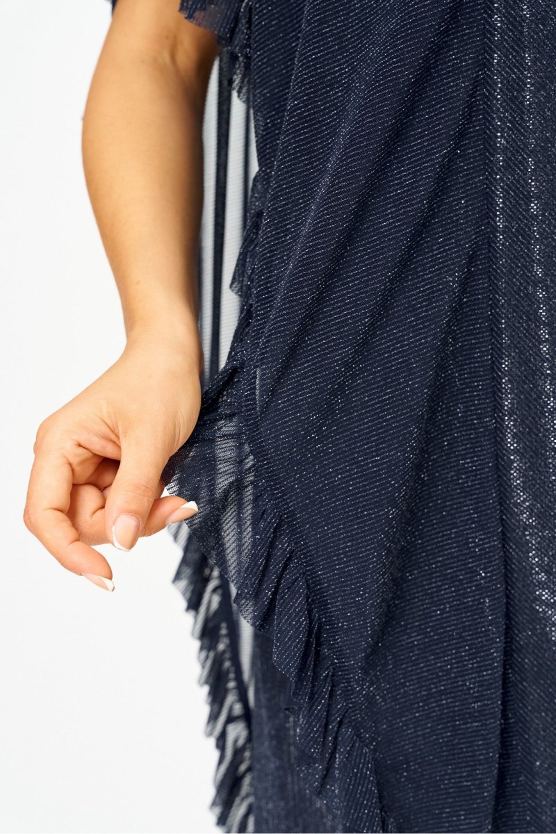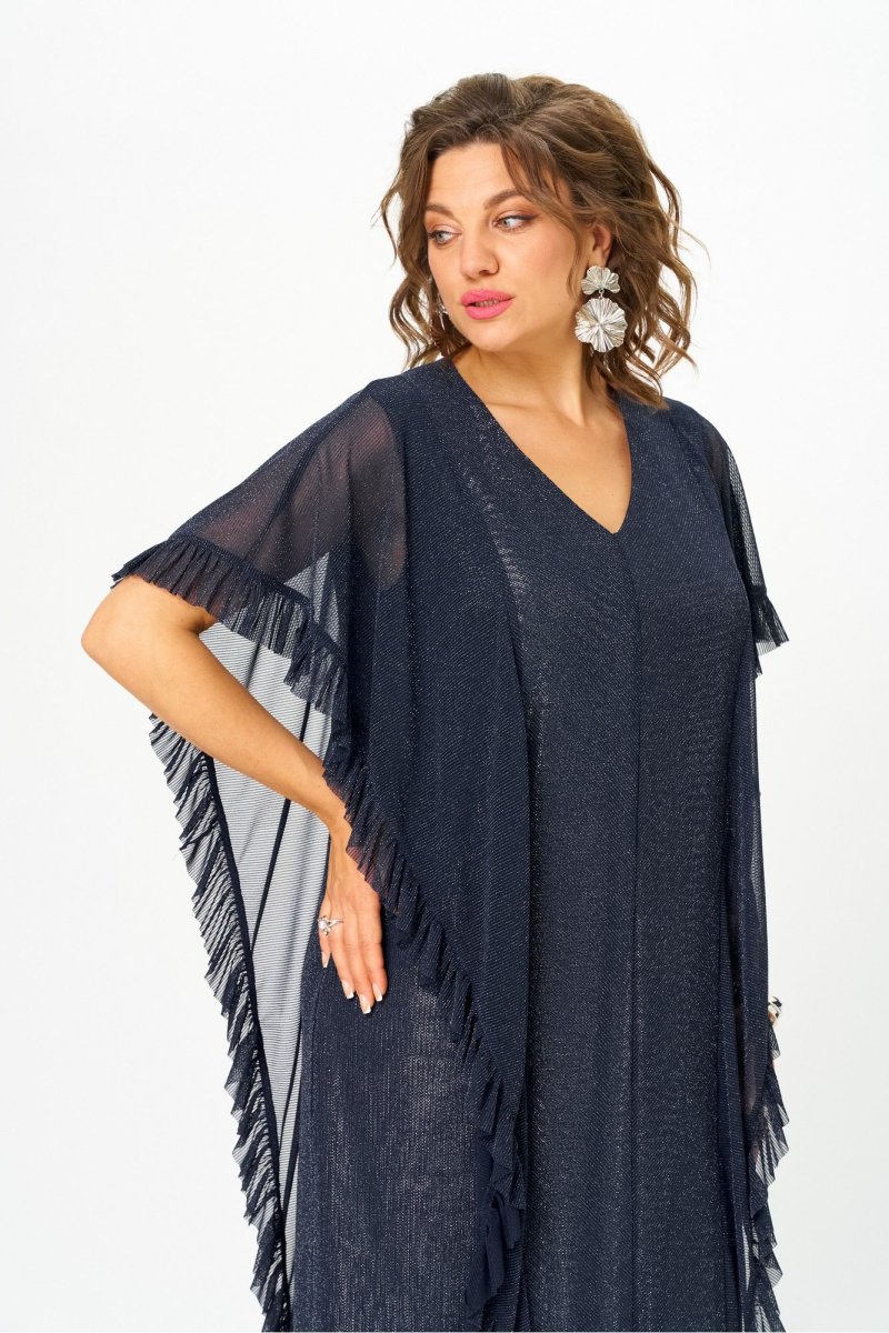 Женское платье полуприлегающего силуэта, выполнено из сетки с люрексовой полоской с серебристой подкладкой. Горловина V-образной формы, обтачена, на полочке выполнен средний шов, также выполнены вертикальные подрезы, в них втачены отлетные детали с рюшей. Отлетные элементы по боковым подрезам прекрасно скрывают некоторые недостатки фигуры и визуально делают силуэт стройнее. Спинка идентична полочке, как и полочка, выполнена из сетки с люрексовой полоской, в качестве подкладки серебристый текстиль. Элегантное платье из эффектной ткани и оригинальным кроем отлично подчеркнёт достоинства фигуры и сделает ваш образ стильным. в 58р. Ширина груди- 63см, Ширина талии -65см, Ширина бедер- 69см, длина рукава- 36см.