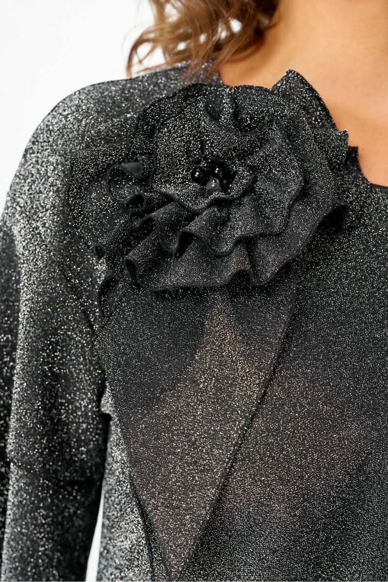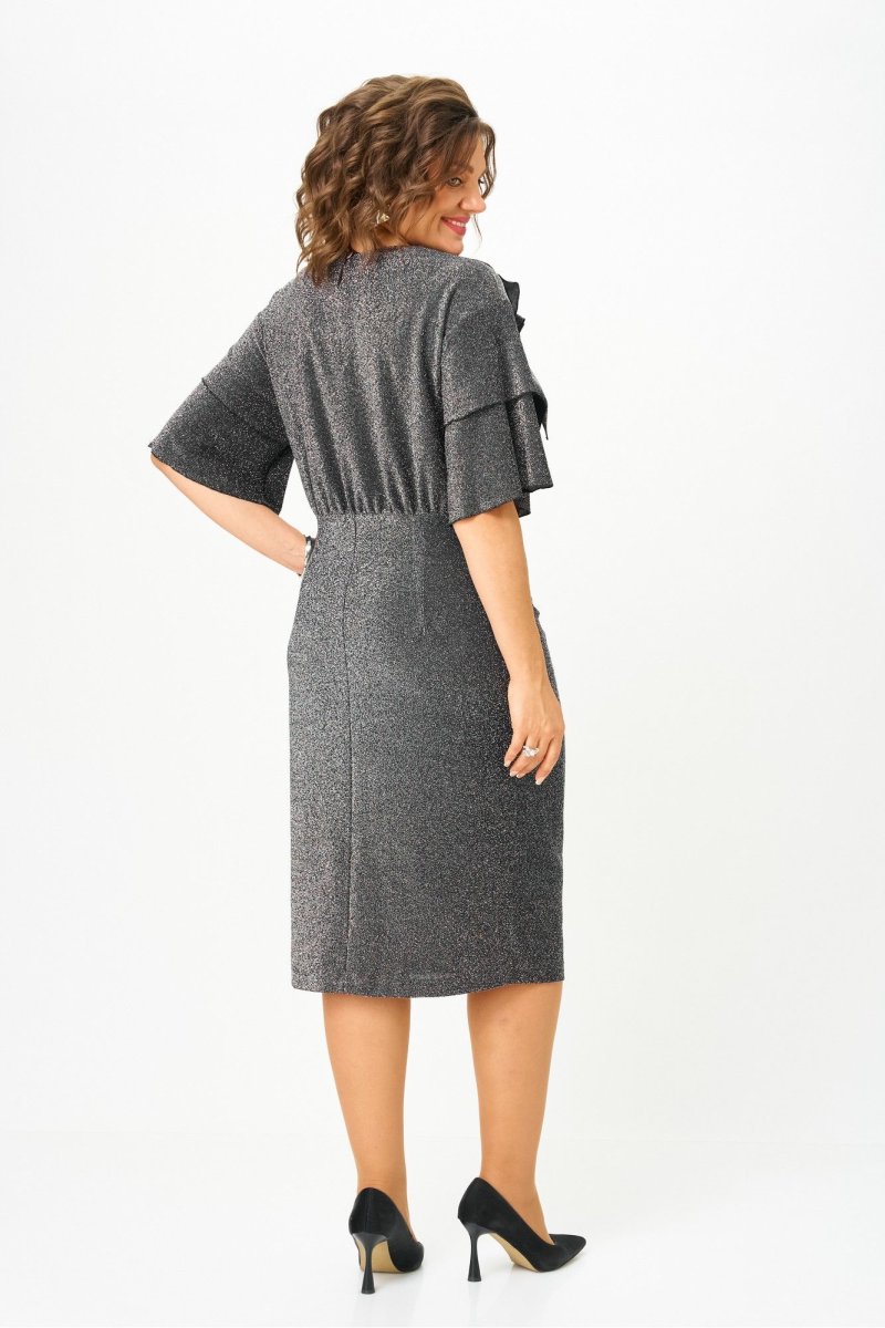 Элегантное, женское платье прилегающего силуэта, выполнено из трикотажного полотна с люрексом. Лиф платья отрезной по линии талии, горловина округлой формы, на обтачке. На лифе выполнена сборка по линии талии, по горловине декор в виде цветка из основной ткани. Юбка платья прямого покроя, по одной стороне втачной бочок со сборкой. Рукав втачной, укороченный и расклешенный к низу, состоит из двух воланов. Спинка идентична полочке, со средним швом и вытачками, отрезное по линии талии. Нарядное платье отлично подойдет для любого мероприятия. в 52р. Ширина груди- 53см, Ширина талии -46см, Ширина бедер- 56см, длина рукава- 27см, ширина рукава 21см.
