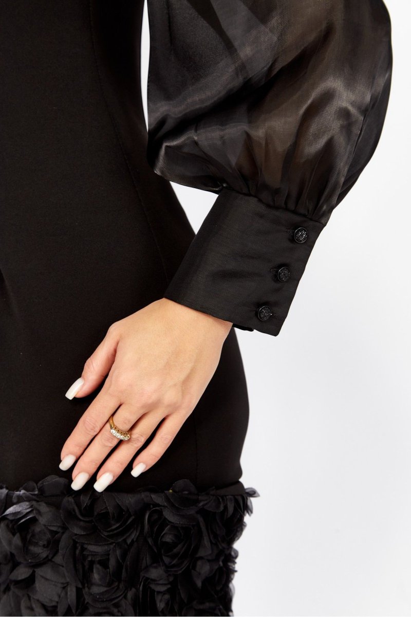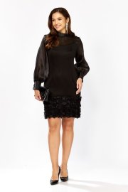 Эффектное женское платье полуприлегающего силуэта, выполнено из трикотажного полотна и органзы. Лиф платья отрезной по линии талии, кокетка лифа выполнена из органзы, нижняя часть из трикотажного полотна, с рельефами. Юбка платья прямого покроя, выполнена из трикотажного полотна, по низу притачная планка из декоративной ткани с объемными розами. Спинка идентична полочке, со средним швом, по горловине обработана стойка из органзы, по спинке застегивается на петлю-пуговицу. Рукав на спущенной пройме, из органзы, по низу присборен на манжет с застежкой на петли-пуговицы. Стильное платье с эффектным декором отличный выбор для торжественных мероприятий! в 46р. Ширина груди- 46см, Ширина талии -40см, Ширина бедер- 50см, длина рукава- 65см, ширина рукава 21см.