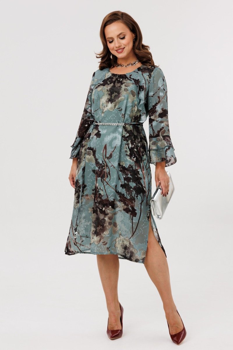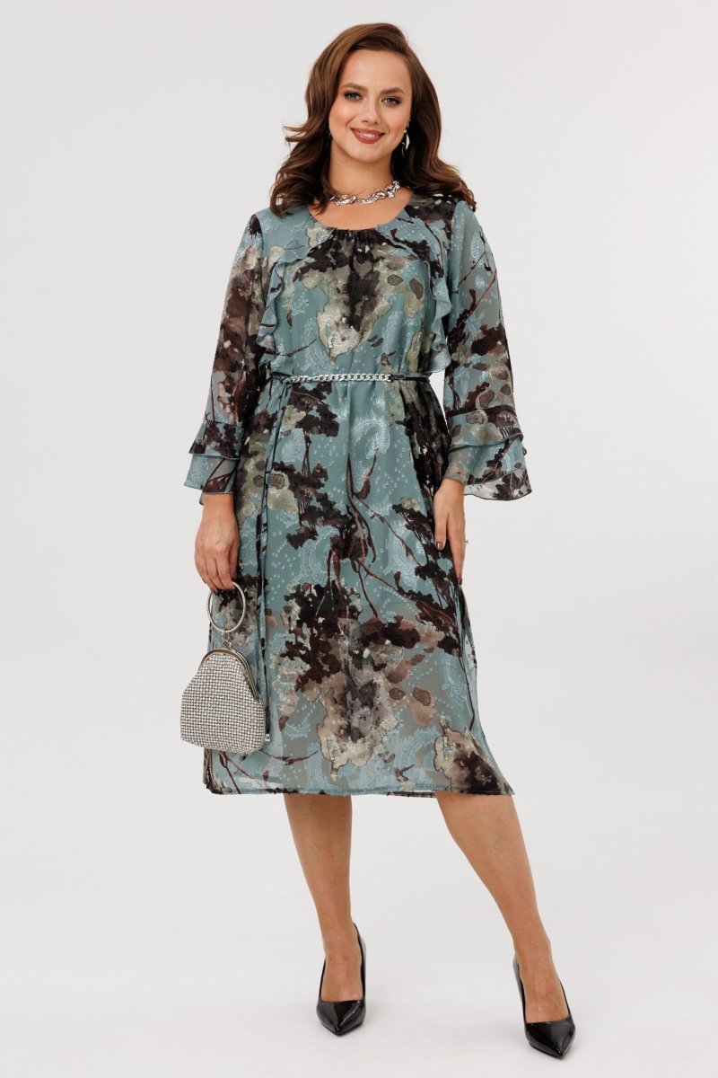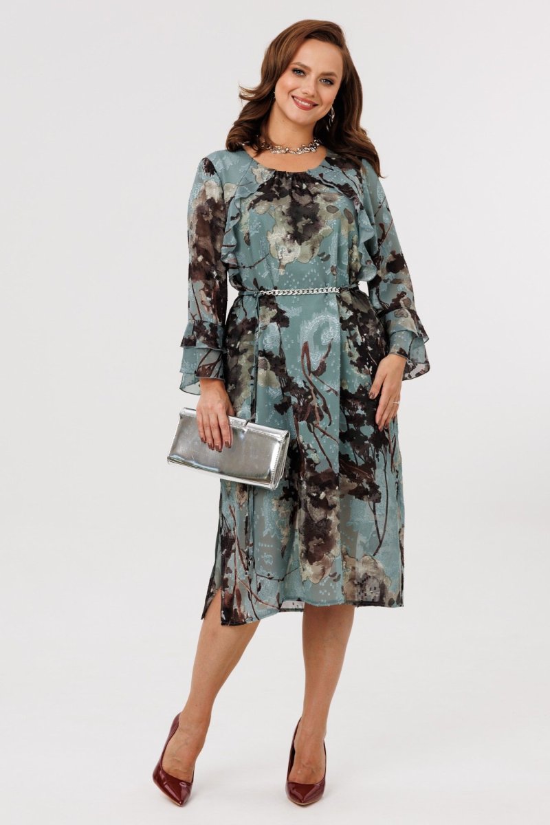 Элегантное женское платье А-силуэта, выполненное из плательной шифоновой ткани (не тянется), на подкладке (тянется). По переду наклонные подрезы, в которые вставлены воланы. Горловина округлой формы, присборенная резинкой по центру. Спинка цельная. Рукава втачные, одношовные, длиной 7/8. По низу рукавов два притачных волана. В комплект входит пояс из основной ткани с декоративной цепочкой.