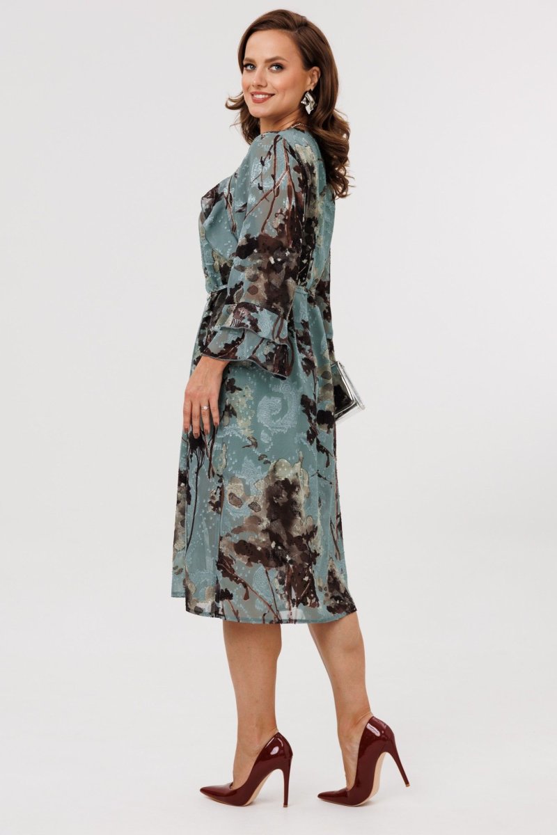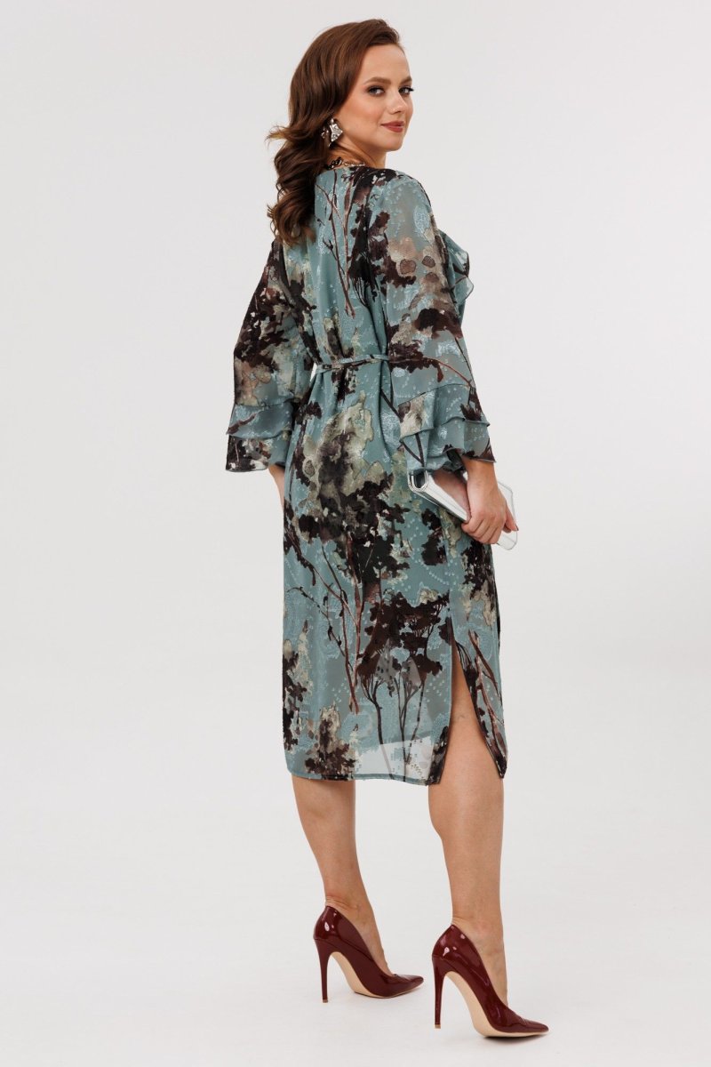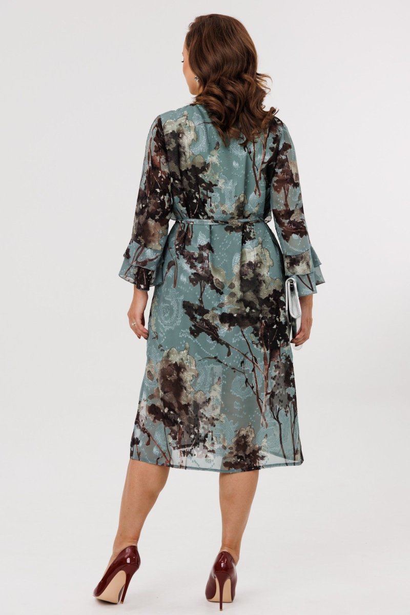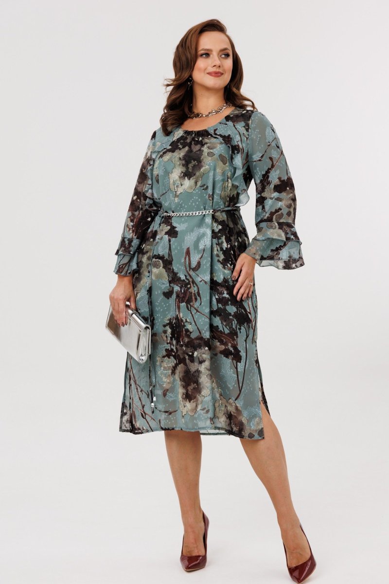Элегантное женское платье А-силуэта, выполненное из плательной шифоновой ткани (не тянется), на подкладке (тянется). По переду наклонные подрезы, в которые вставлены воланы. Горловина округлой формы, присборенная резинкой по центру. Спинка цельная. Рукава втачные, одношовные, длиной 7/8. По низу рукавов два притачных волана. В комплект входит пояс из основной ткани с декоративной цепочкой.
