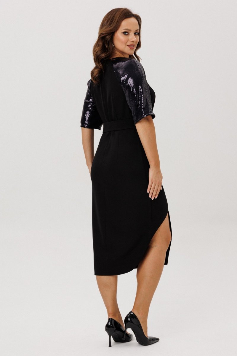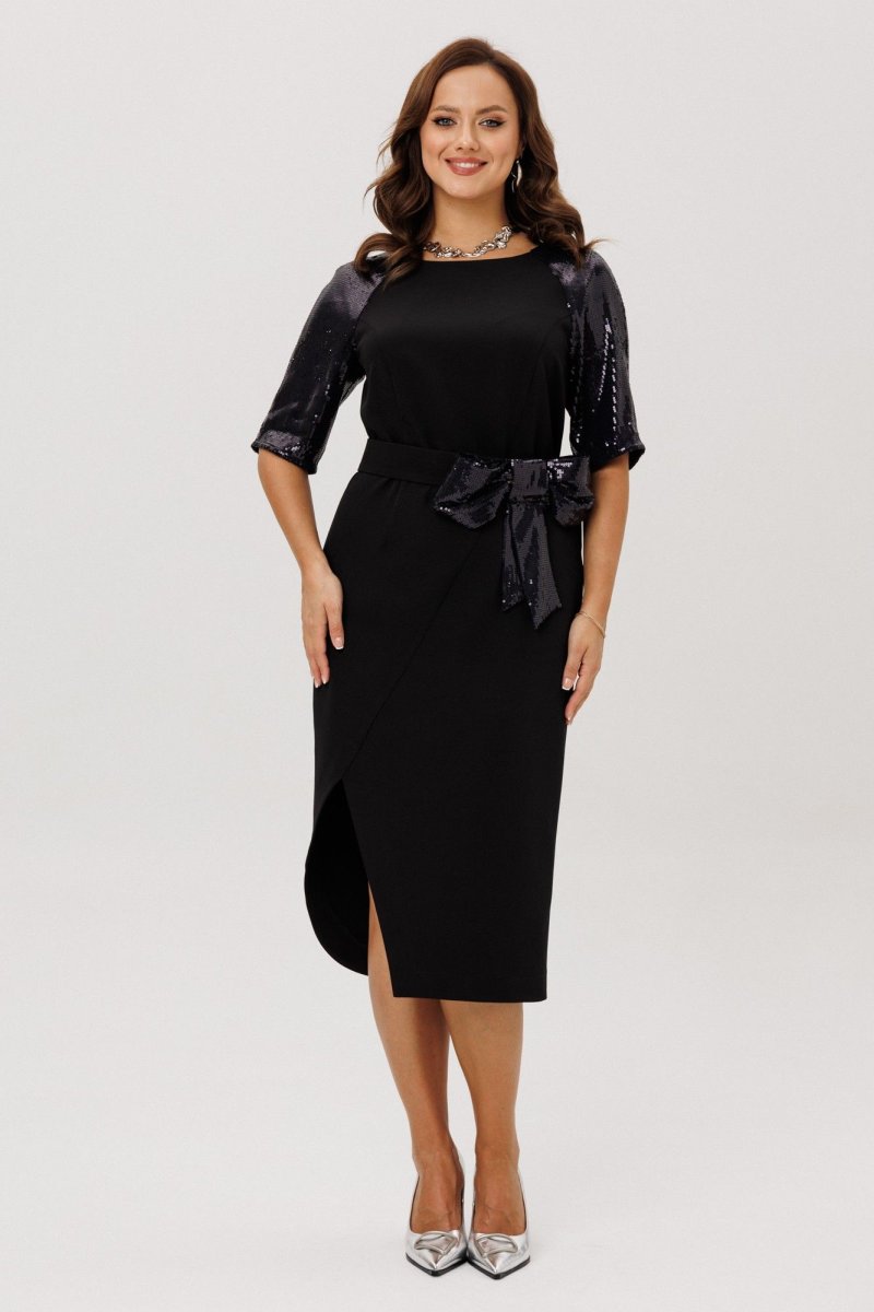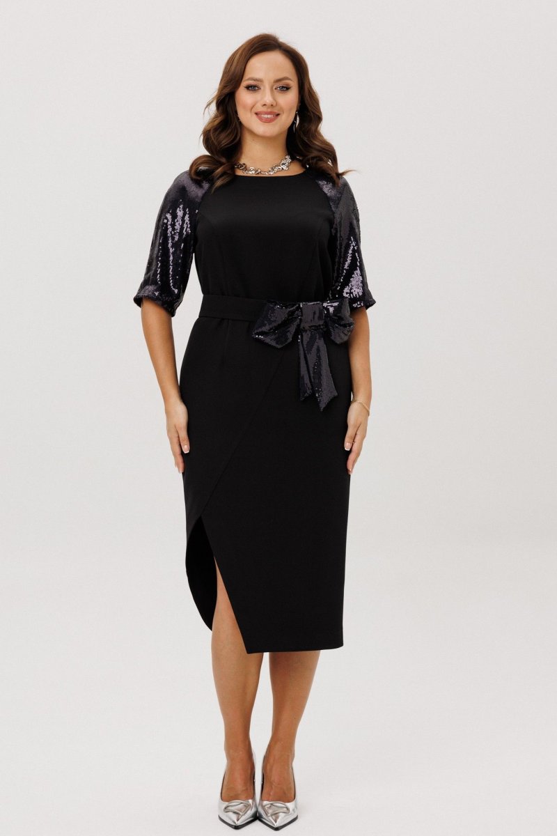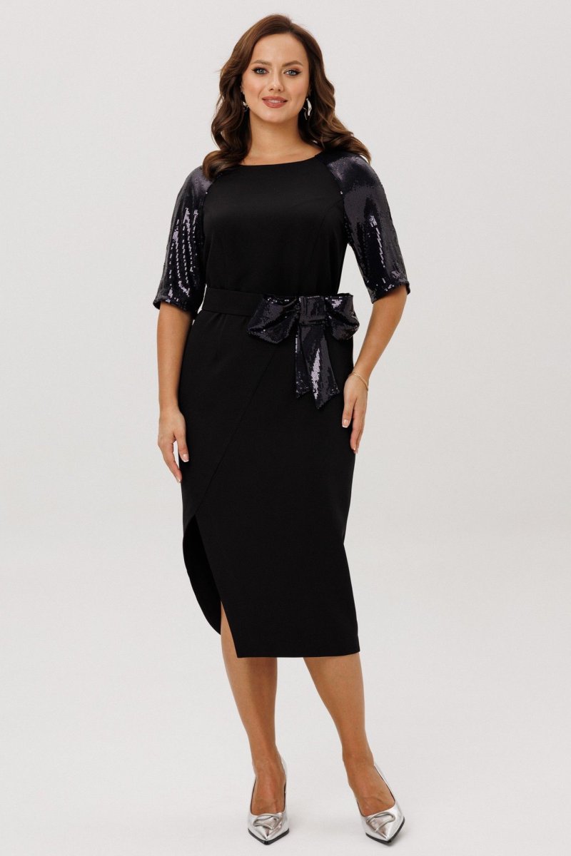 Платье полуприлегающего силуэта, покроя «Реглан». По переду ассиметричный подрез, переходящий в рельеф. Рельеф переходит в талиевую вытачку. По спинке средний шов, потайная застежка-молния и талиевые вытачки. Низ переда и спинки фигурной формы с разрезом по переду. Горловина округлой формы. Рукава-реглан со швом по середине и на подкладке. Само платье без подкладки. В комплект входит съемный пояс, выполненный из основной ткани, декорированный пышным бантом из пайеток.
