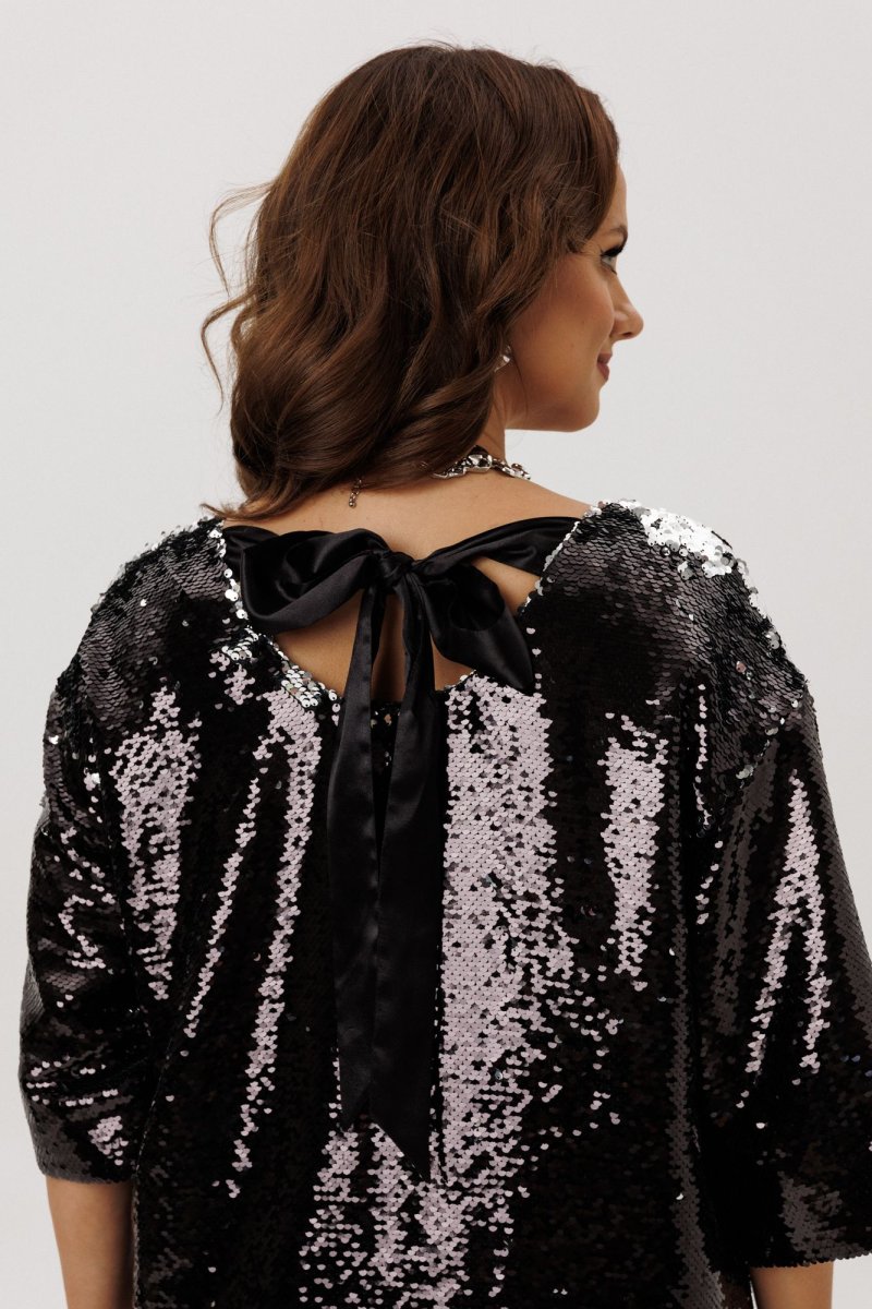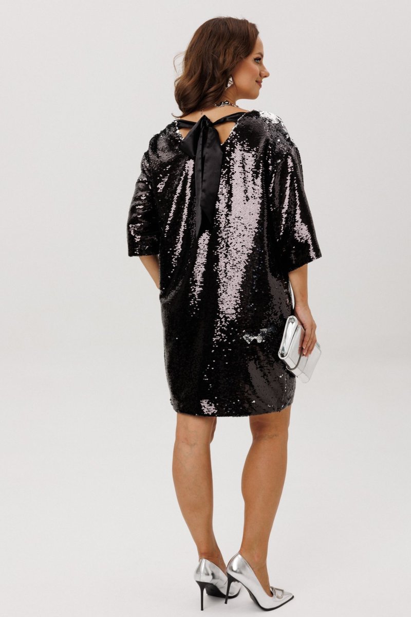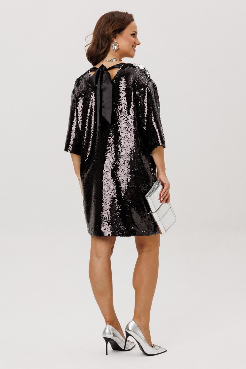 Нарядное женское платье свободного силуэта со спущенной линией плеча, выполнено из плательной ткани с пайетками (не тянется). Перед и спинка – цельные. Горловина по переду V-образной формы, по спинке – округлой формы, в вырез которой вставлен декоративный бант из шифона. Рукава втачные, одношовные. Платье на подкладке.