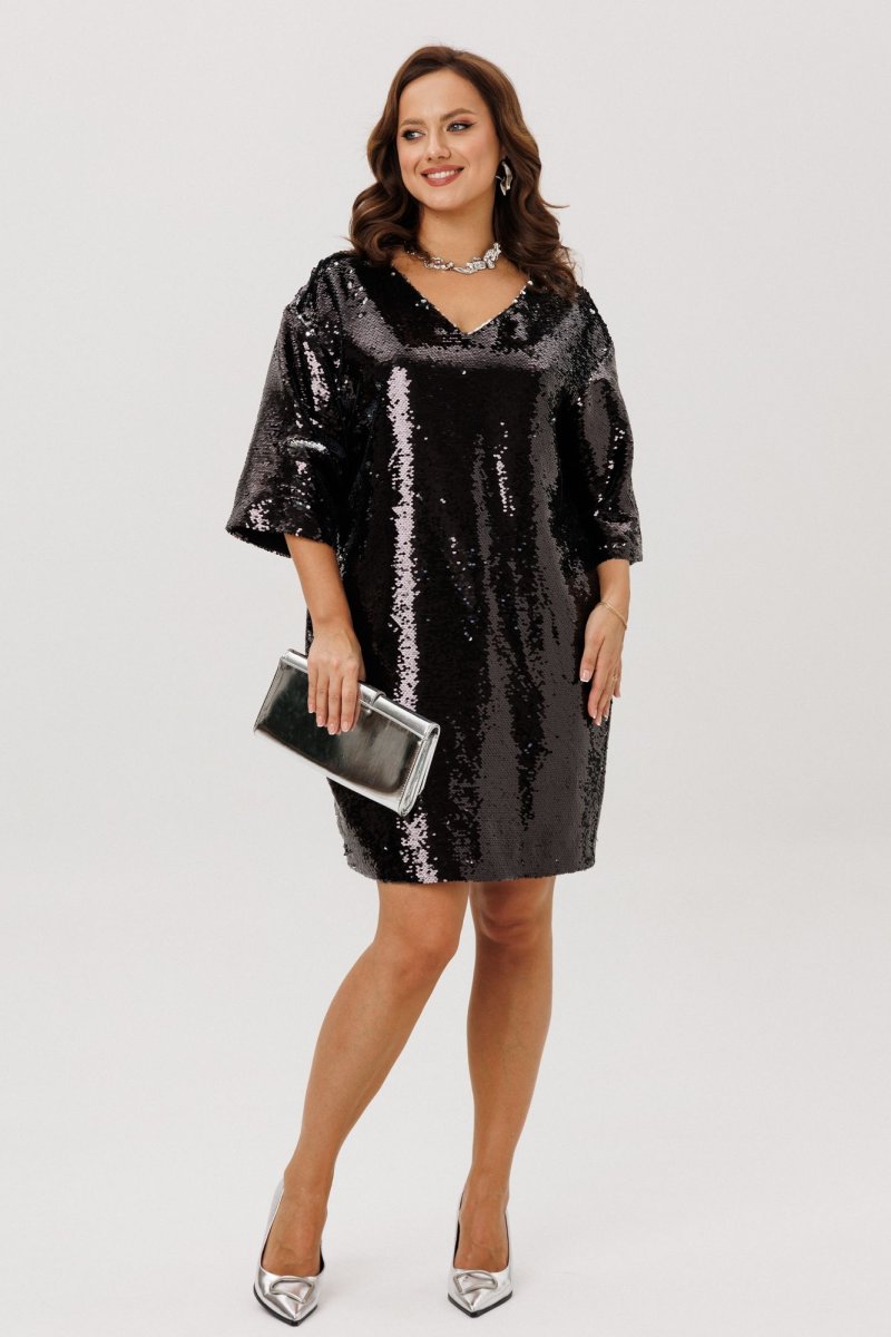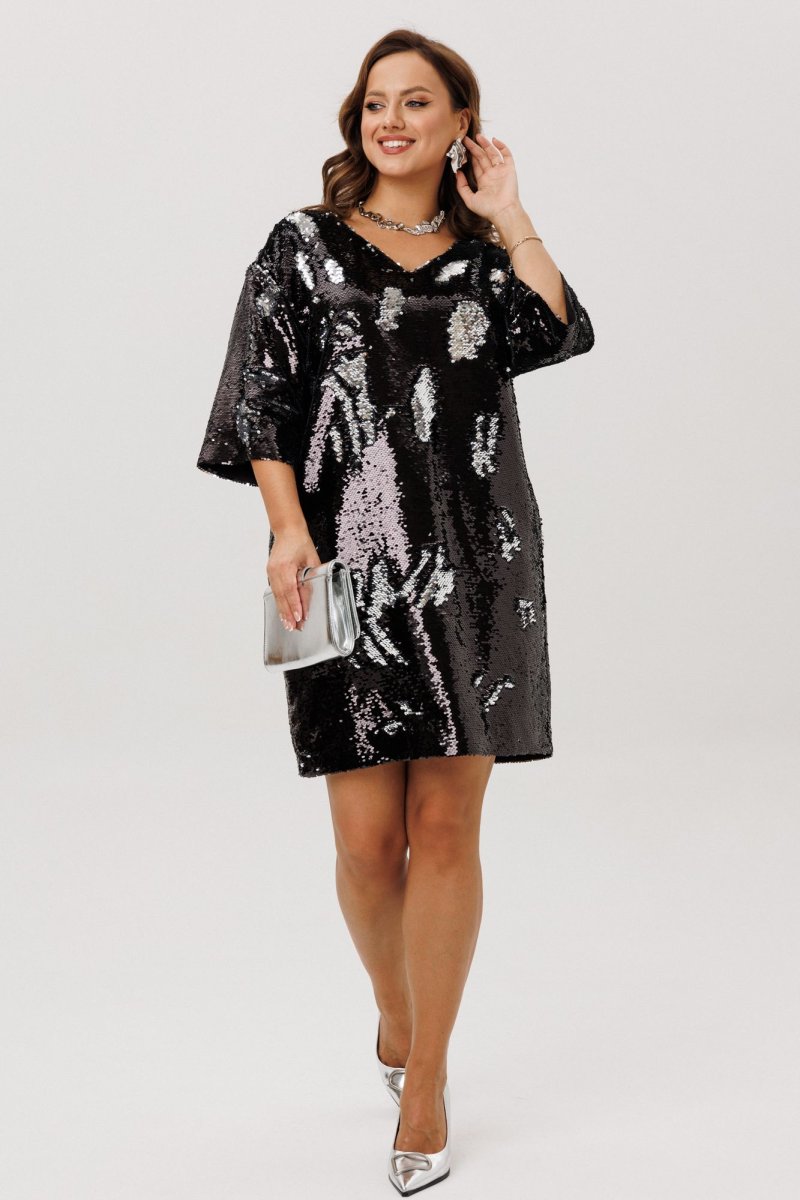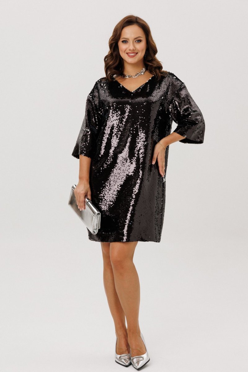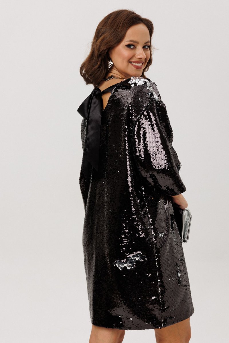Нарядное женское платье свободного силуэта со спущенной линией плеча, выполнено из плательной ткани с пайетками (не тянется). Перед и спинка – цельные. Горловина по переду V-образной формы, по спинке – округлой формы, в вырез которой вставлен декоративный бант из шифона. Рукава втачные, одношовные. Платье на подкладке.