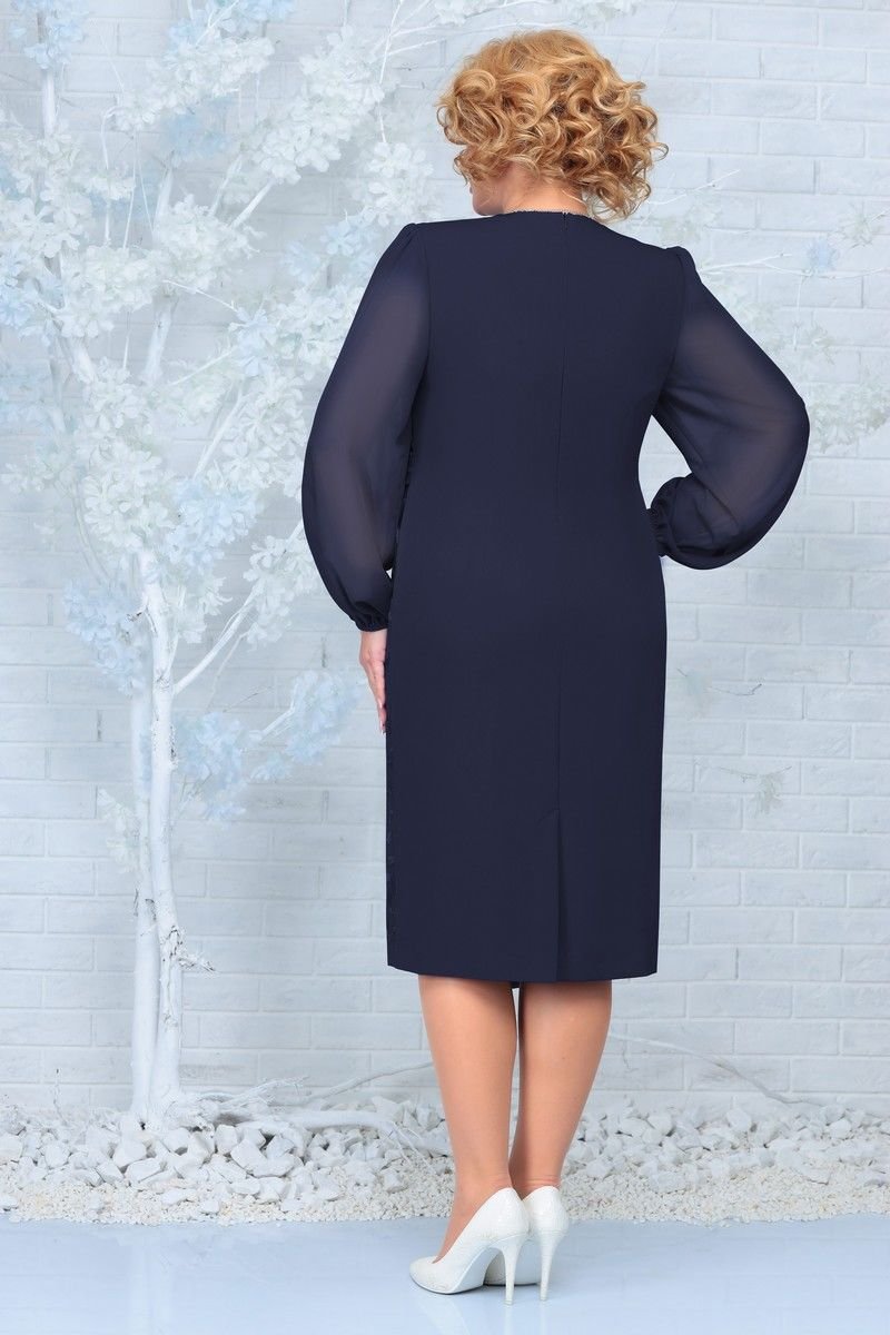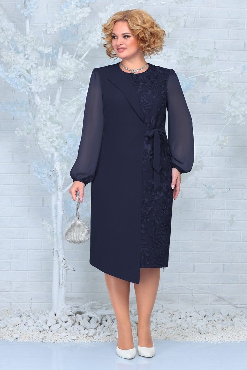 2299 Платье женское Платье женское, полуприлегающего силуэта, чуть зауженное к низу, из костюмно-плательной ткани, на трикотажной подкладке. Длина 107,0 см. по среднему шву спинки. Перед с нагрудными вытачками, идущими из проймы, с ассиметричным подрезом, выходящим справа налево от горловины до низа. В подрез, от горловины до талии, вставлен лацкан, в низу правая часть переда длиннее на 8 см. Левая часть переда двухслойная: нижний слой выполнен из костюмно-плательной ткани, верхний - из гипюра. На талии расположен пояс-бант из шифона. Спинка с талиевыми вытачками, со средним швом, в верхней части которого расположена застежка на потайную тесьму- молнию, в нижней – шлица.Горловина округлая, углубленная спереди. Рукава втачные, одношовные, со сборкой по окату, низ собран на резинку. Выполнены из шифона. Длина рукавов 63 см. Платье с плечевыми накладками.