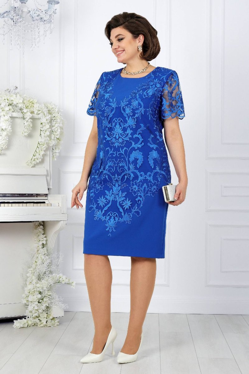 Платье женское, полуприлегающего силуэта, зауженное к низу, выполнено из костюмно- плательной ткани и гипюра, длина по среднему шву спинки 48-52 размер - 102 см; 54-62 размер - 104 см. Перед и спинка платья с настроченным гипюром, с фигурным низом, направленным от бокового шва вниз к центру. Перед с нагрудными вытачками из проймы. Спинка с талиевыми вытачками и средним швом, в котором обработана шлица. Застёжка на потайную тесьму -"молнию" расположена в левом боковом шве. Вырез горловины переда и спинки округлой формы, по переду углубленный. Рукава втачные, одношовные из гипюра. Низ рукава оформлен фестонами. Длина рукава 48-52 размер - 26 см; 54-62 размер - 33 см. Платье с плечевыми накладками.