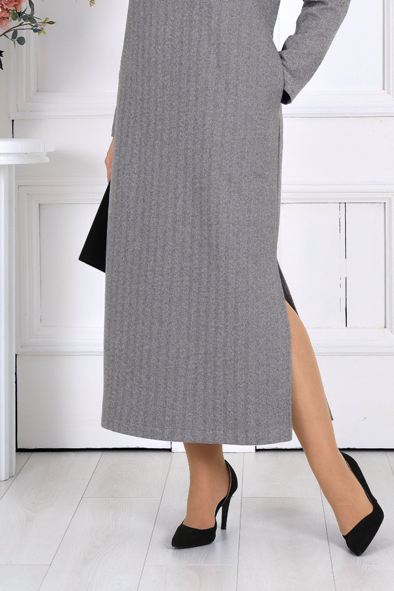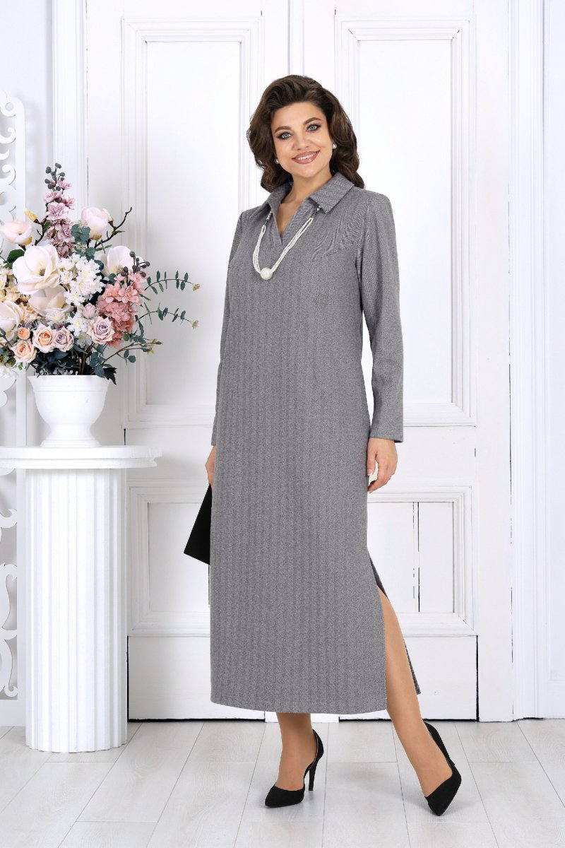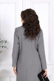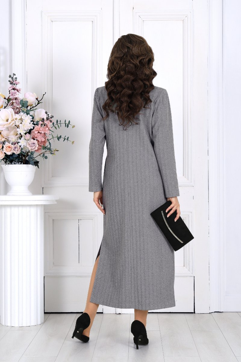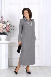 Платье женское, прямого силуэта, расширенное к низу, выполнено из трикотажного полотна. Платье женское прямого силуэта, длиной по среднему шву спинки 124 см, от шва втачивания воротника. Перед платья с нагрудными вытачками из проймы. Спинка со средним швом. В боковых швах обработаны карманы и разрезы. Воротник рубашечного типа, по переду планка «поло». Рукав втачной, одношовный, длиной 60 см. Платье без подкладки.