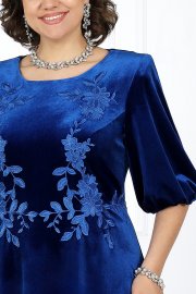 Платье женское, выполнено из трикотажного полотна «велюр». Модель на трикотажной подкладке, с плечевыми накладками и застежкой на потайную тесьму-«молнию» (50 см) в среднем шве спинки. Платье отрезное по линии талии, с лифом полуприлегающего силуэта и расширенной к низу юбкой. Лиф с нагрудными вытачками по переду и талиевыми по спинке. От горловины лифа вниз, переходя на юбку, настрочены симметричные аппликации. Рукав втачной, трехчетвертной; низ сосборен эластичной лентой. Длина платья -- 105 см; длина рукава - 39 см.