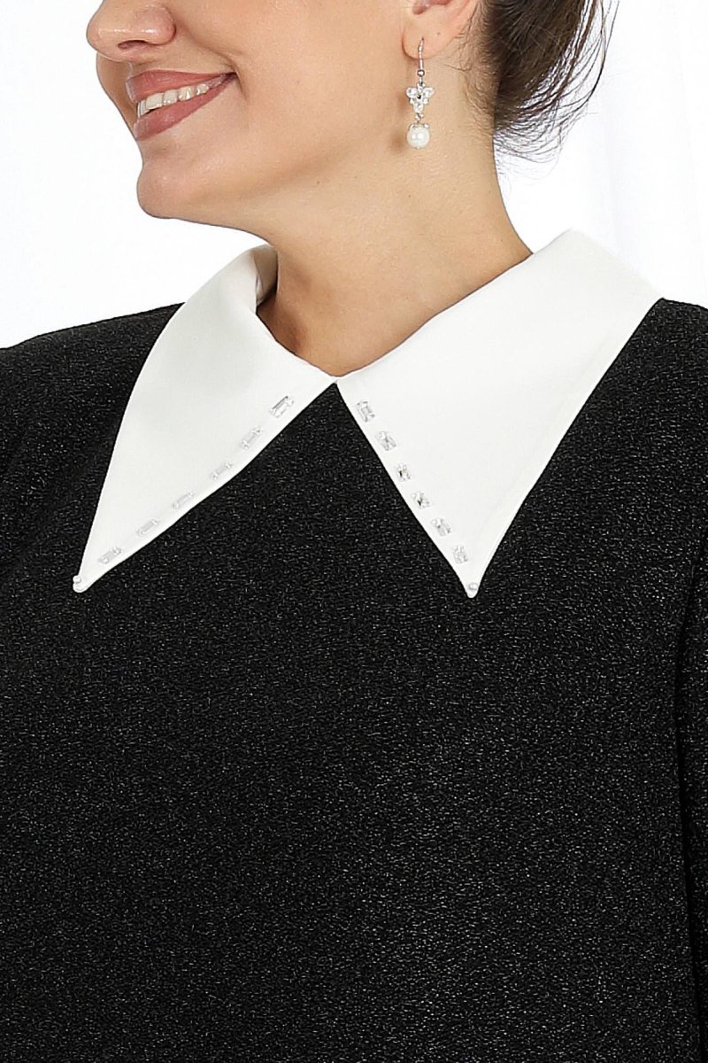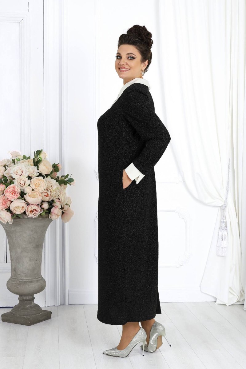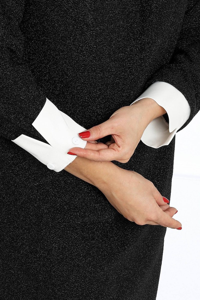 Это платье станет прекрасным выбором для вечерних мероприятий, деловых встреч или особых случаев, когда хочется быть уверенной в себе и выглядеть восхитительно. Выполненное из трикотажного полотна с изысканной фактурой и блеском люрекса, оно привлекает взгляд и подчеркивает вашу индивидуальность. Воротник и манжеты легко снимаются, превращая платье из нарядного вечернего в более повседневный вариант.