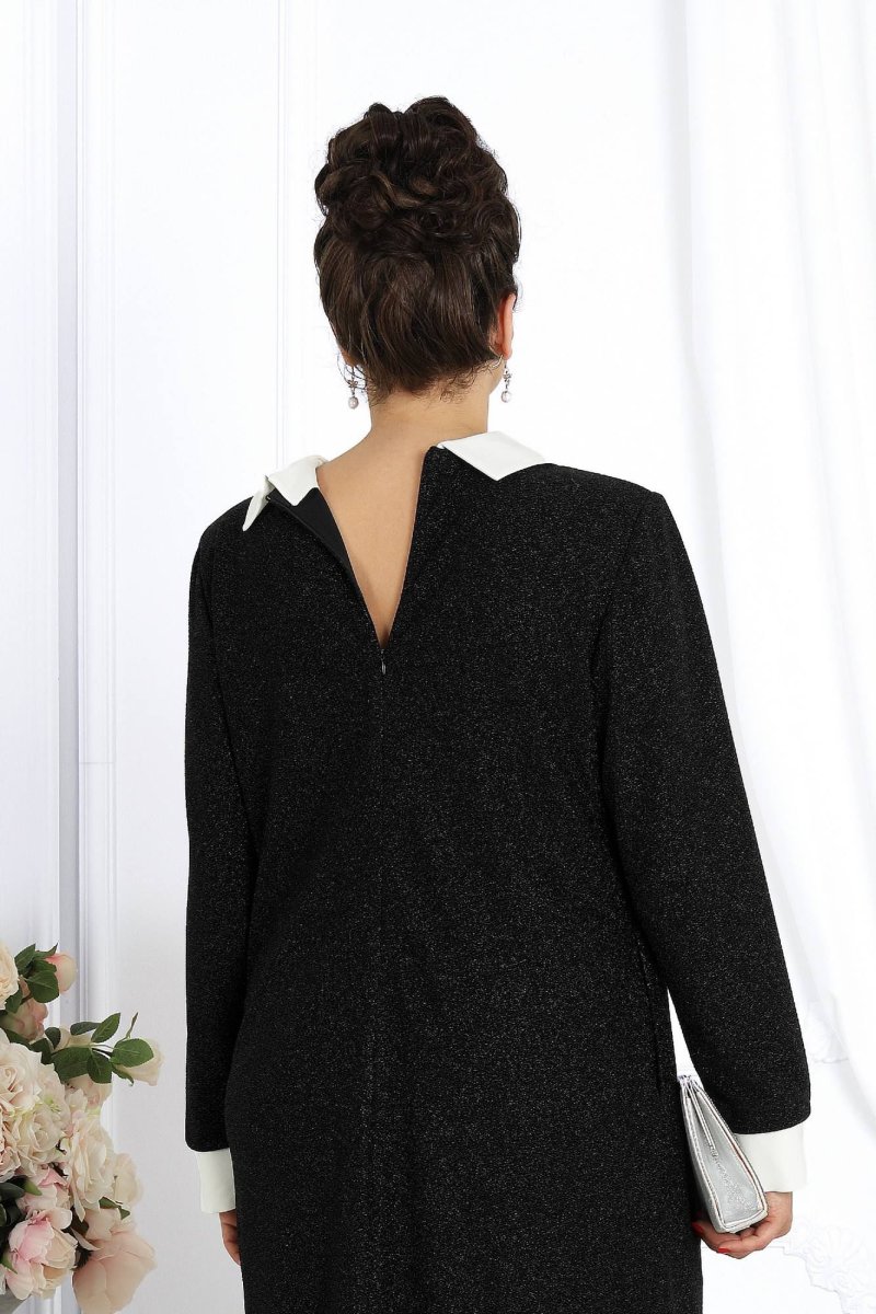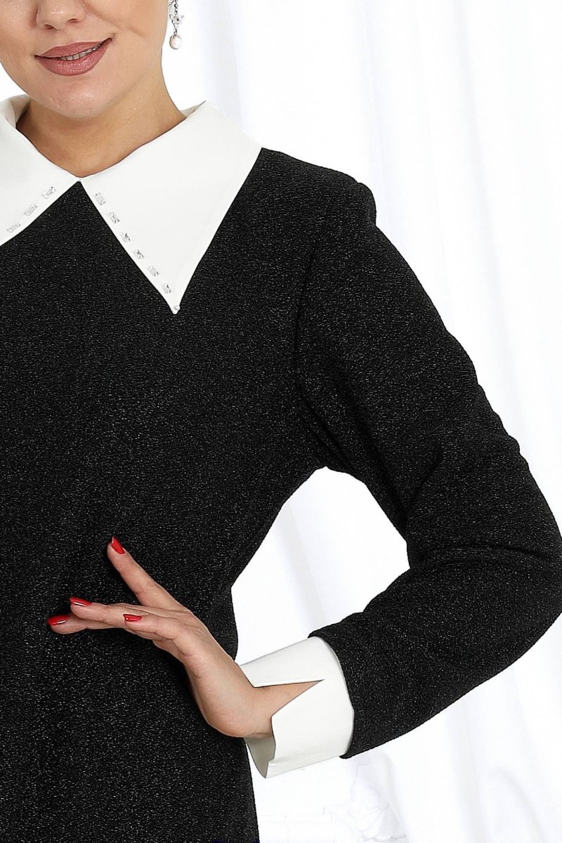 Платье женское полуприлегающего силуэта, выполнено из трикотажного полотна с фактурной лицевой стороной «люрекс». Модель с карманами в боковых швах, на трикотажной подкладке, с плечевыми накладками. Перед с нагрудными вытачками, направленными от пройм. В верхней части среднего шва спинки расположена застежка на тесьму-«молнию» (50 см), в нижней - разрез. Круглая горловина оформлена съемным воротником, декорированным спереди пришивными камнями. Рукав длинный, втачной, низ оформлен съемной манжетой с разрезом. Воротник и манжеты выполнены из сатина и пристегиваются к изделию при помощи прорезных петель и пуговиц.