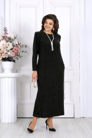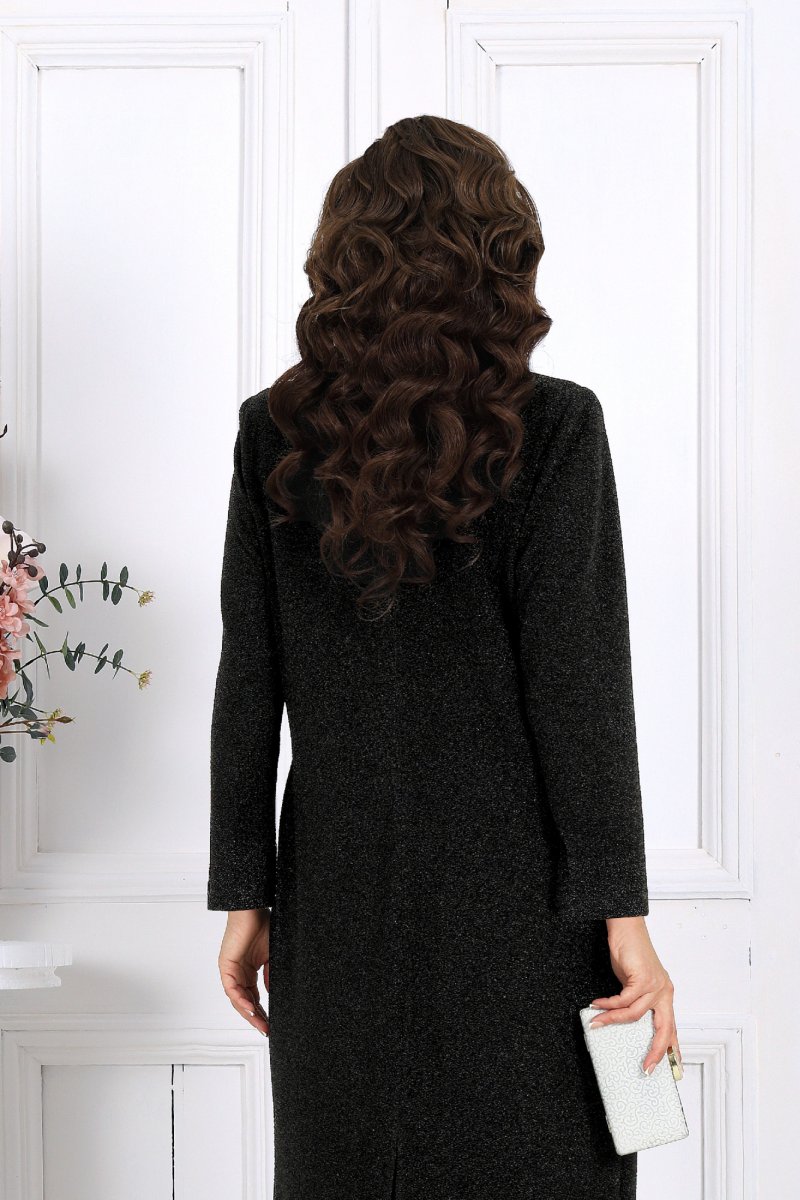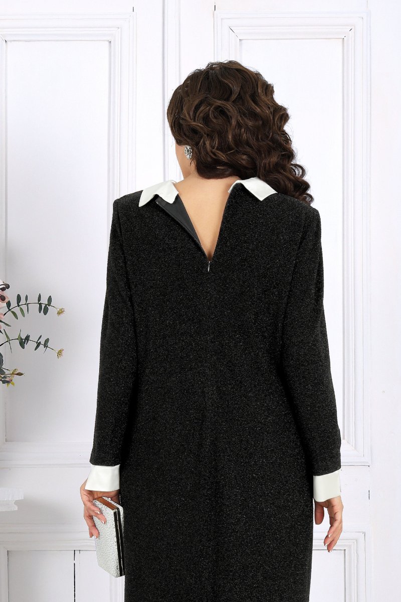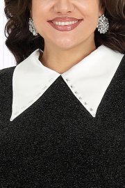 Платье женское полуприлегающего силуэта, выполнено из трикотажного полотна с фактурной лицевой стороной «люрекс». Модель с карманами в боковых швах, на трикотажной подкладке, с плечевыми накладками. Перед с нагрудными вытачками, направленными от пройм. В верхней части среднего шва спинки расположена застежка на тесьму-«молнию» (50 см), в нижней - разрез. Круглая горловина оформлена съемным воротником, декорированным спереди пришивными камнями. Рукав длинный, втачной, низ оформлен съемной манжетой с разрезом. Воротник и манжеты выполнены из сатина и пристегиваются к изделию при помощи прорезных петель и пуговиц.