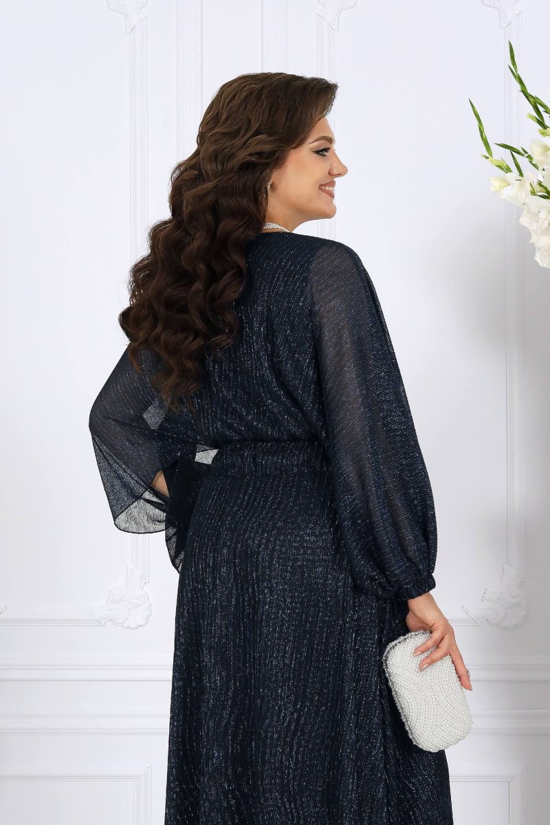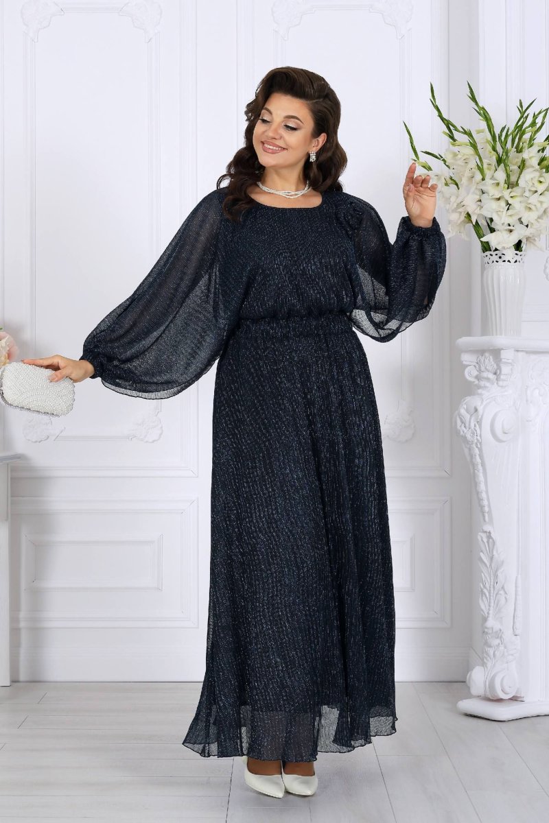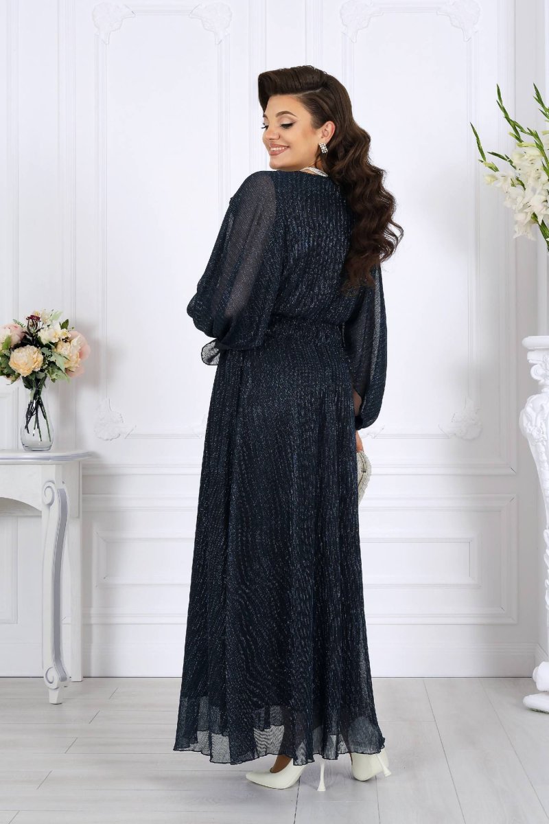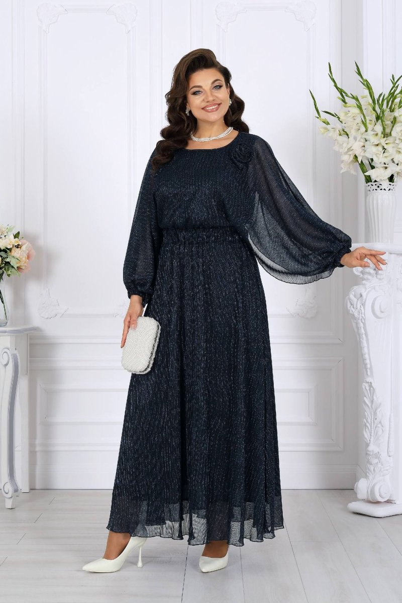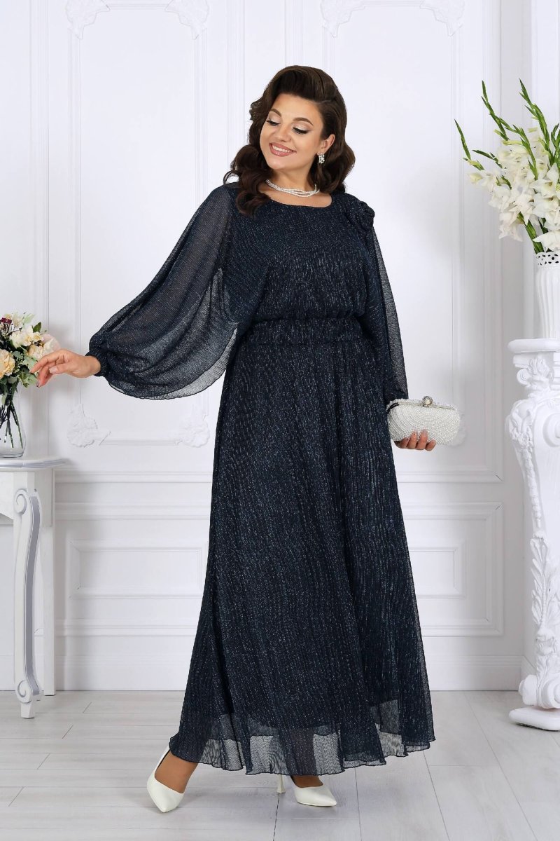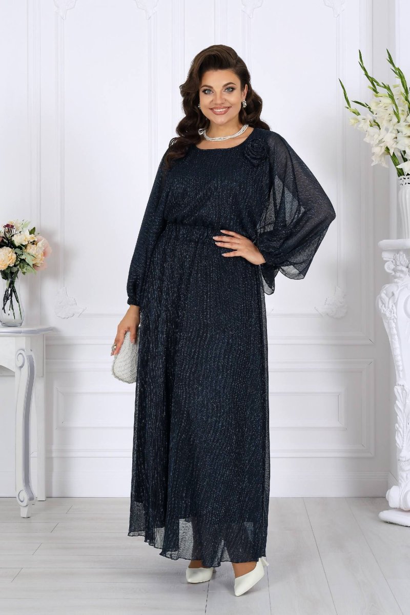 Платье женское, приталенного силуэта, выполнено из сетки-гофре с нитью «люрекс». Модель на трикотажной подкладке, без застежки и плечевых накладок. Платье отрезное по линии талии, со свободным лифом и расширенной к низу юбкой. Для лучшего прилегания в области талии в отрезном поясе предусмотрена эластичная лента, вставленная по всей длине. Лиф цельнокроеный с рукавами, без боковых швов -- с разрезами от талии до манжет. Для регулирования длины рукава внутрь манжеты протянута эластичная лента. Горловина округлая, окантована узкой косой бейкой из основного материала. Платье дополнено съемным «цветком» з основного полотна. Длина платья (от горловины спинки) – 139 см, длина платья (от талии спинки) – 97 см; длина рукава (от горловины до манжеты) – 70 см (50-52 р-р), 71 см (54-58 р-р), 74 см (60-64 р-р).