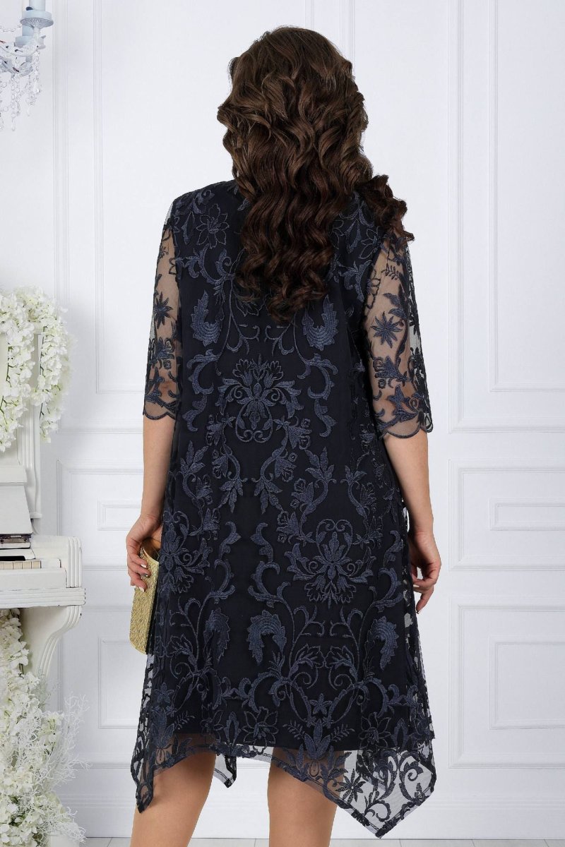 Платье женское, расклешенное к низу, выполнено из гипюра и сатина. Длина платья по середине спинки 105,5 см. Перед и спинка платья двухслойные: верхний слой выполнен из гипюра, нижний – из сатина. Низ переда и спинки в верхнем слое из гипюра фигурной формы. Перед с нагрудными вытачками, в верхнем и нижнем слое, идущими из пройм. Горловина переда и спинки округлая, по переду углубленная. Рукава втачные, одношовные, выполнены из гипюра. Низ рукавов оформлен фестонами. Длина рукавов 42см.