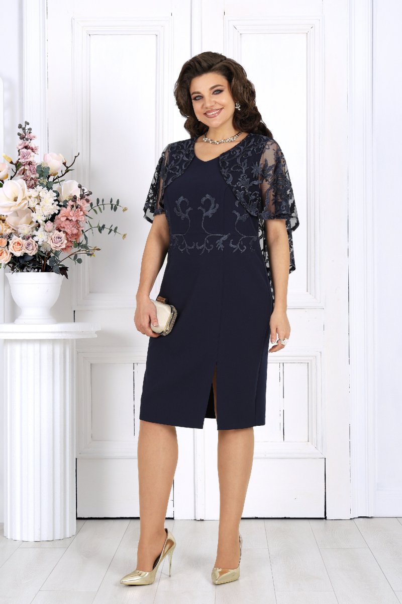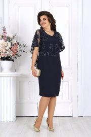Платье женское, полуприлегающего силуэта, выполнено из костюмно-плательной ткани и гипюра. Модель на трикотажной подкладке, без рукавов и плечевых накладок. Перед отрезной по линии талии; на верхней части обработаны рельефы, направленные от пройм, на нижней – талиевая вытачка и рельефный шов с разрезом внизу. Лиф переда декорирован настрочной аппликацией. Спинка с талиевыми вытачками и средним швом, в верхней части которого обработана застежка на потайную тесьму-«молнию» (50см). Вырез горловины спинки округлый, по переду – углубленный, V-образный. В шов обтачивания горловины входит пелерина из гипюра, разъемная по середине переда и спинки; низ пелерины асимметричный, укороченный спереди. Длина платья – 104 см.
