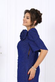 Платье женское полуприлегающего силуэта, выполнено из трикотажного полотна с фактурной лицевой стороной «люрекс». Модель на трикотажной подкладке, с плечевыми накладками. В левом боковом шве обработана застежка на потайную тесьму-«молнию» (35 см). Перед платья с горизонтальным подрезом по линии талии и отлетной деталью в шве подреза. В правой части переда обработан рельеф с разрезом в нижней части. Вдоль рельефного шва заложены односторонние складки, направленные к центру переда. Спинка с талиевыми вытачками. Горловина спинки округлая, по переду V-образная, углубленная. Рукав короткий, втачной, формы «крылышко на запах», со скругленными краями. Платье дополнено съемным «цветком» из основного полотна. Длина платья - 136 см; длина рукава - 31 см.