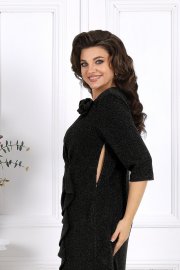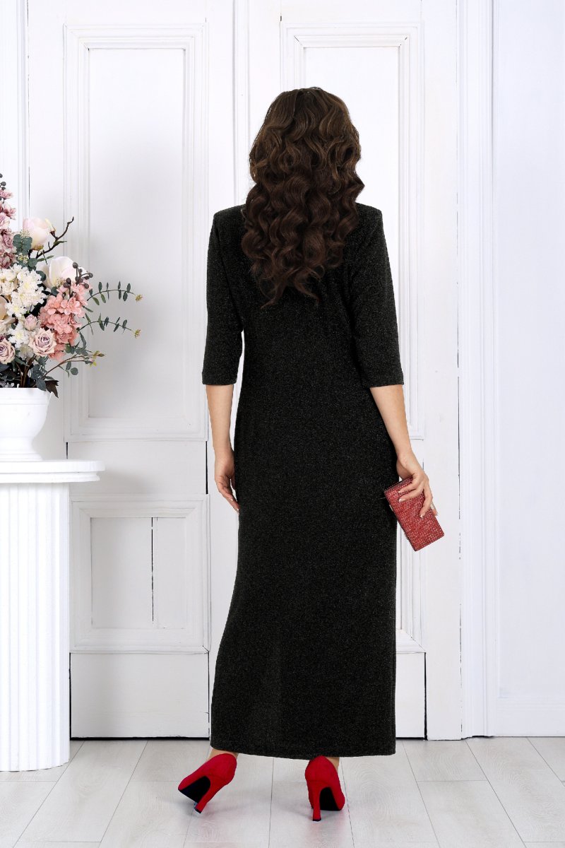 Платье женское полуприлегающего силуэта, выполнено из трикотажного полотна с фактурной лицевой стороной «люрекс». Модель на трикотажной подкладке, с плечевыми накладками и застежкой в левом боковом шве на потайную тесьму-«молнию» (35 см). Перед отрезной по линии талии. Верхняя часть переда состоит из двух деталей, скрепленных на запах; вдоль горизонтального подреза заложены односторонние складки. На нижней части переда обработан рельефный шов с двойным воланом в верхней части и разрезом по низу; от шва к центру направлены односторонние складки. На спинке обработаны талиевые вытачки. Рукав трехчетвертной. Платье дополнено съемным «цветком» из основного полотна. Длина платья – 134 см; длина рукава – 42 см.