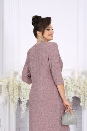 Платье женское полуприлегающего силуэта, выполнено из трикотажного полотна с фактурной лицевой стороной «люрекс». Модель на трикотажной подкладке, с плечевыми накладками и застежкой в левом боковом шве на потайную тесьму-«молнию» (35 см). Перед отрезной по линии талии. Верхняя часть переда состоит из двух деталей, скрепленных на запах; вдоль горизонтального подреза заложены односторонние складки. На нижней части переда обработан рельефный шов с двойным воланом в верхней части и разрезом по низу; от шва к центру направлены односторонние складки. На спинке обработаны талиевые вытачки. Рукав трехчетвертной. Платье дополнено съемным «цветком» из основного полотна. Длина платья – 134 см; длина рукава – 42 см.