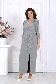 Платье женское полуприлегающего силуэта, выполнено из трикотажного полотна с фактурной лицевой стороной «люрекс». Модель на трикотажной подкладке, с плечевыми накладками и застежкой в левом боковом шве на потайную тесьму-«молнию» (35 см). Перед отрезной по линии талии. Верхняя часть переда состоит из двух деталей, скрепленных на запах; вдоль горизонтального подреза заложены односторонние складки. На нижней части переда обработан рельефный шов с двойным воланом в верхней части и разрезом по низу; от шва к центру направлены односторонние складки. На спинке обработаны талиевые вытачки. Рукав трехчетвертной. Платье дополнено съемным «цветком» из основного полотна. Длина платья – 134 см; длина рукава – 42 см.