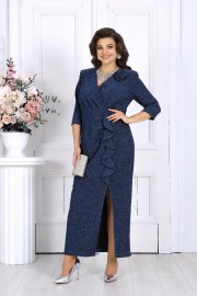 Платье женское полуприлегающего силуэта, выполнено из трикотажного полотна с фактурной лицевой стороной «люрекс». Модель на трикотажной подкладке, с плечевыми накладками и застежкой в левом боковом шве на потайную тесьму-«молнию» (35 см). Перед отрезной по линии талии. Верхняя часть переда состоит из двух деталей, скрепленных на запах; вдоль горизонтального подреза заложены односторонние складки. На нижней части переда обработан рельефный шов с двойным воланом в верхней части и разрезом по низу; от шва к центру направлены односторонние складки. На спинке обработаны талиевые вытачки. Рукав трехчетвертной. Платье дополнено съемным «цветком» из основного полотна. Длина платья – 134 см; длина рукава – 42 см.