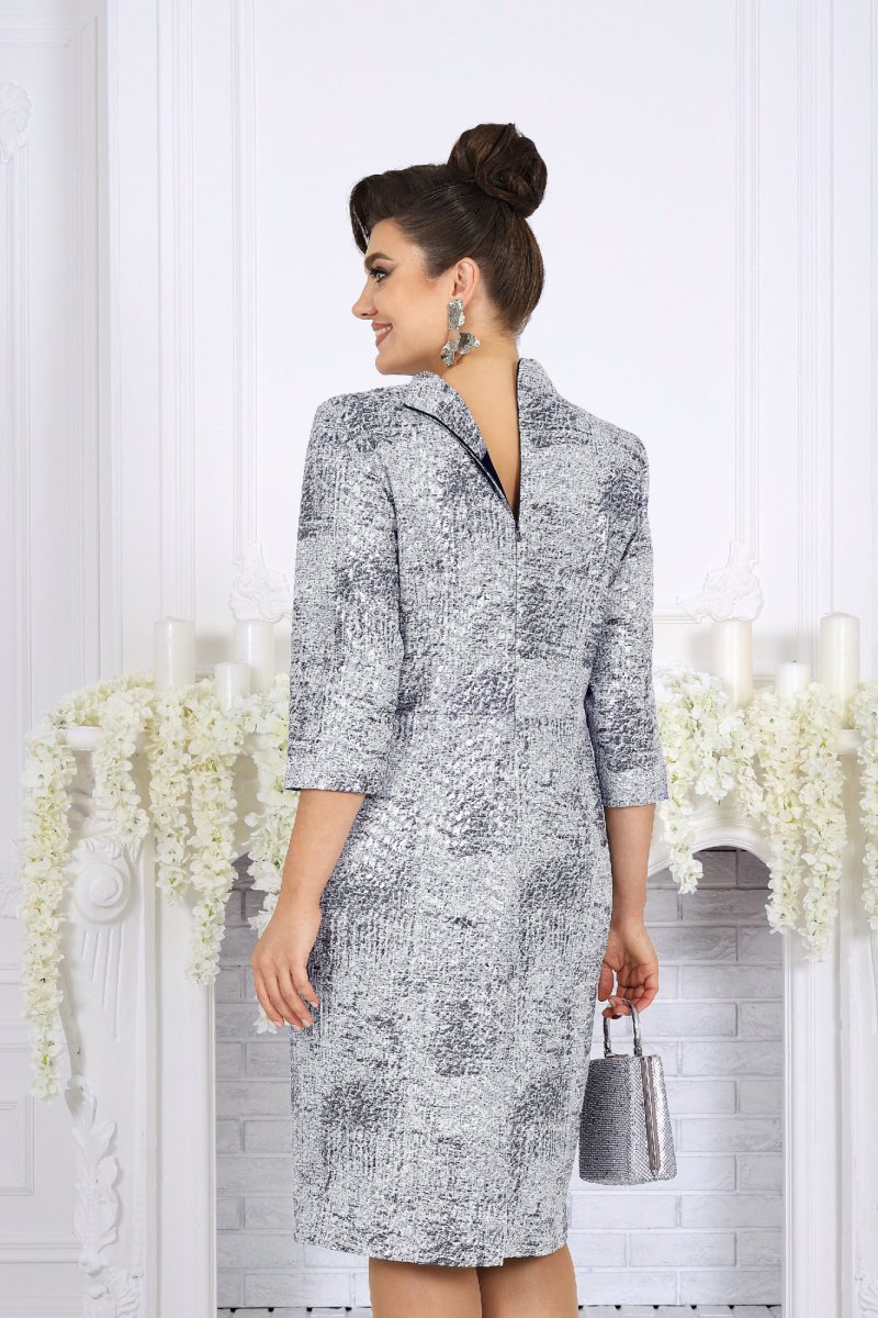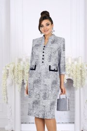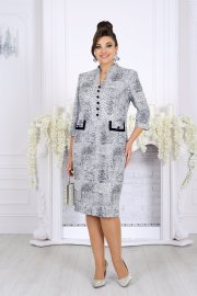 Платье женское, полуприлегающего силуэта, выполнено из жаккардового трикотажного полотна с напылением. Модель на трикотажной подкладке, с плечевыми накладками. Перед отрезной по линии талии: на верхней части обработаны рельефы, направленные от пройм, V-образный вырез и средний шов, декорированный пуговицами; на нижней части обработаны талиевые вытачки и настрочены клапаны с бейками по краю и пуговицами по центру. Спинка отрезная по линии талии; на верхней части обработаны рельефы, направленные от пройм, на нижней – талиевые вытачки и средний шов со шлицей. Горловина оформлена стойкой с закругленными концами. Застежка на потайную тесьму молнию расположена в среднем шве спинки и переходит на стойку. Рукав втачной, трехчетвертной. Бейки клапанов и обтяжные пуговицы выполнены из отделочного трикотажного полотна. Длина платья – 106 см; длина рукава – 45 см.